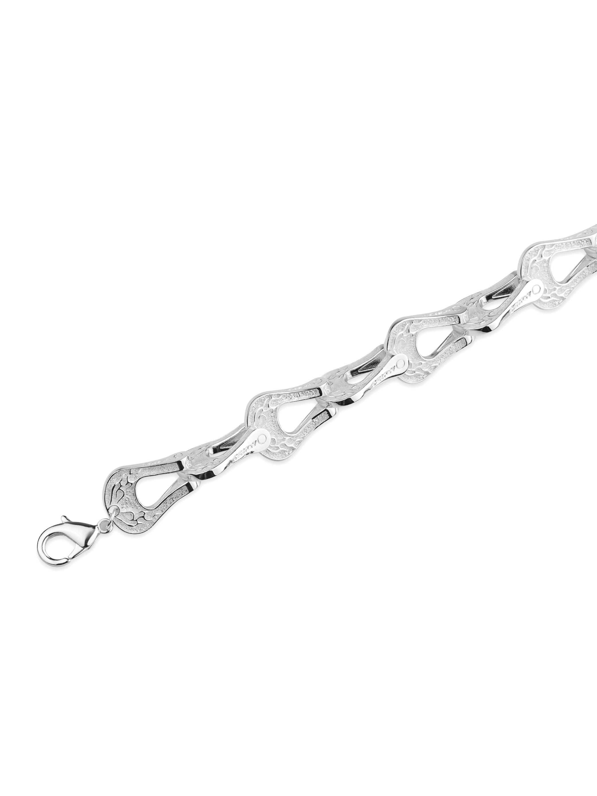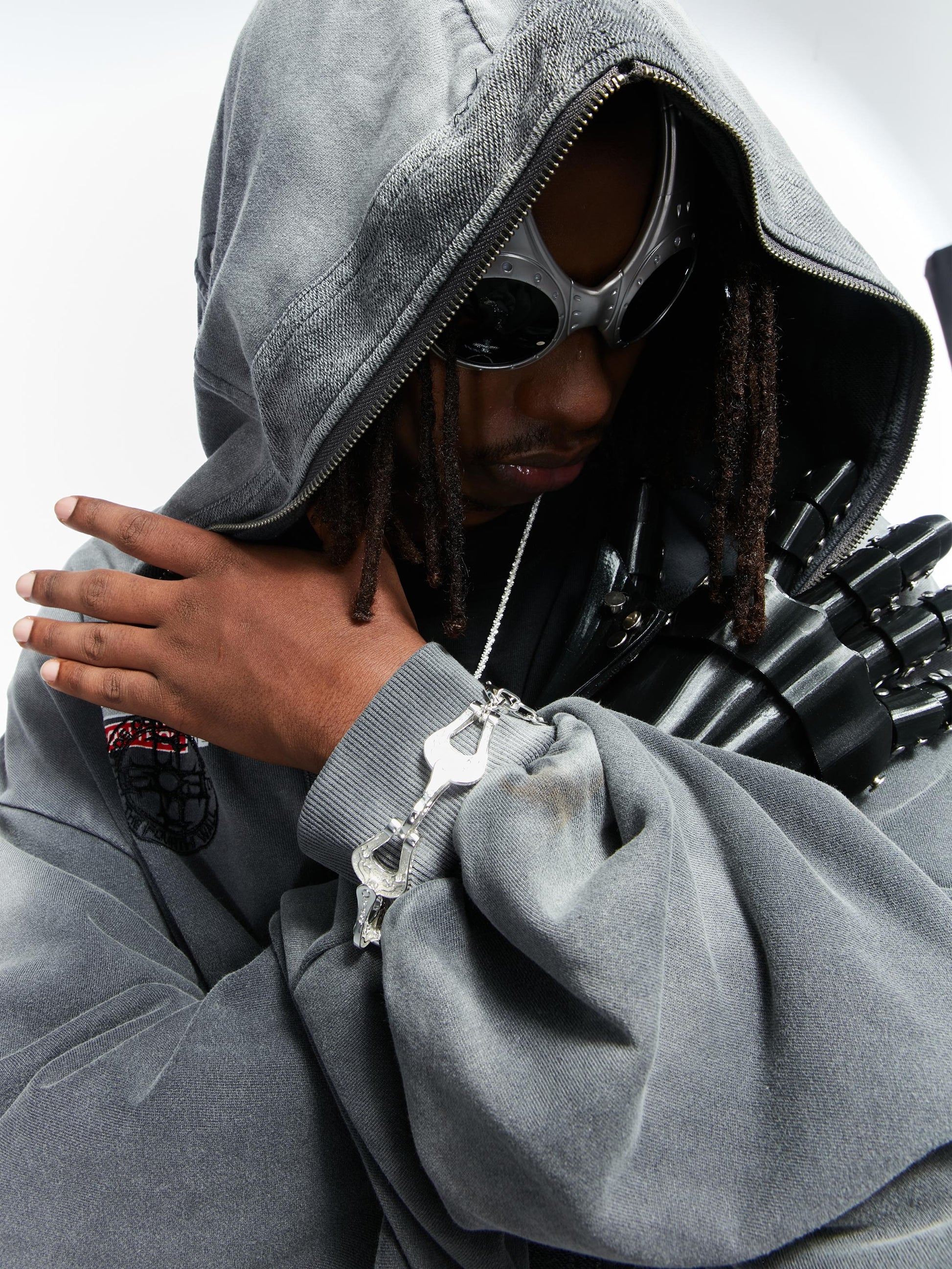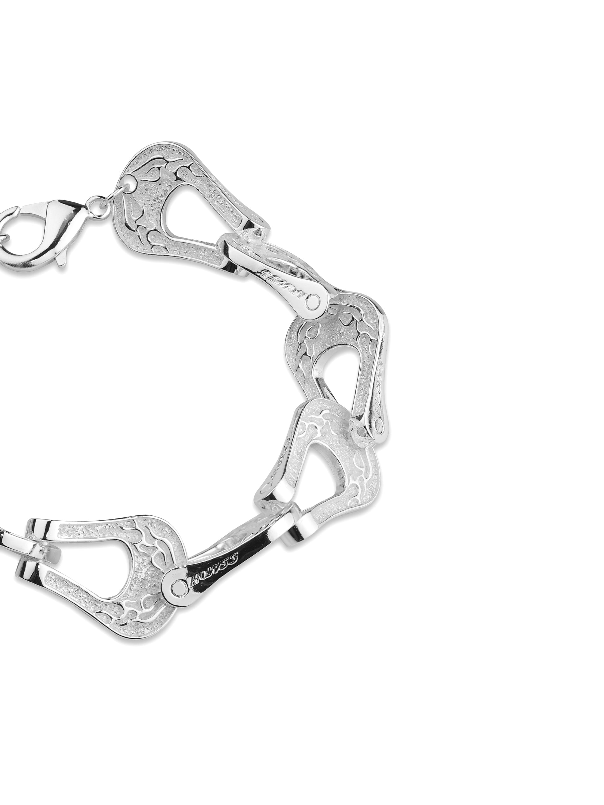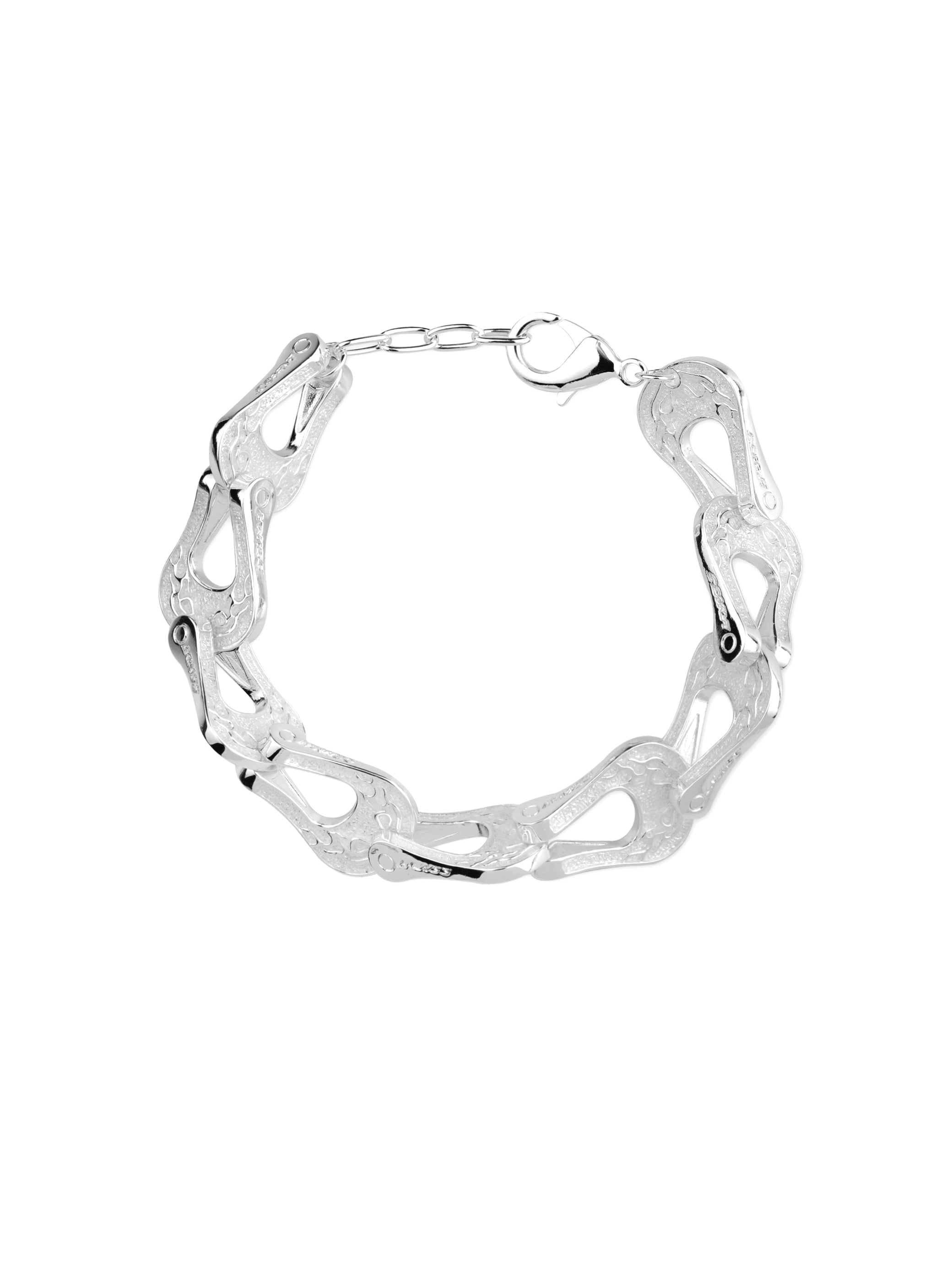 Crafted from high-density alloy and plated with a reinforced silver finish. Every link is individually cast using an open-frame mold, polished by hand to achieve a clean metallic contour. The structure balances rigidity with flex, giving the piece a lightweight yet powerful mechanical presence.