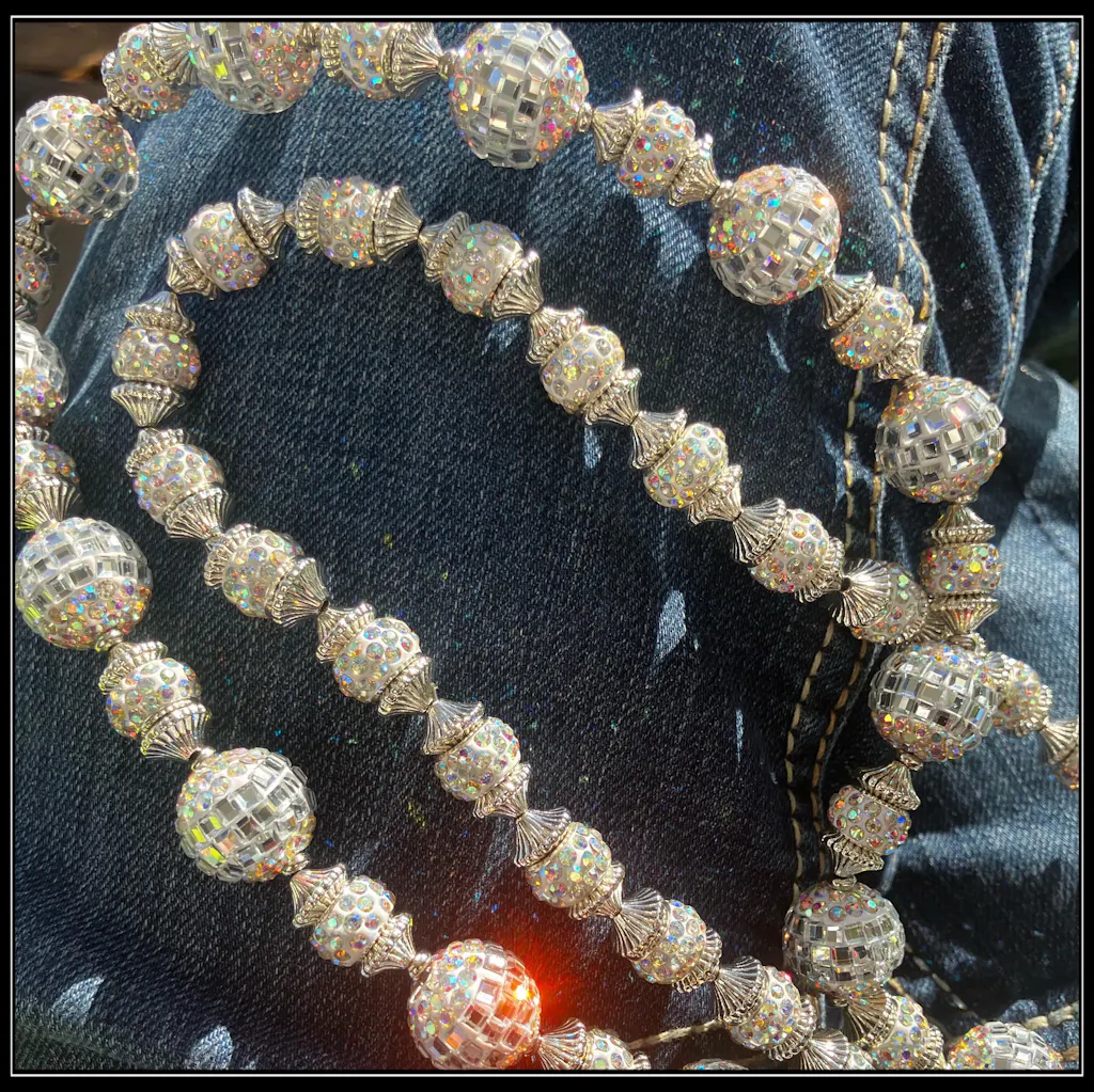 Each bead is hand-set with optical-grade resin, faceted to throw prismatic light from every angle. Because every setting is done by hand, no two beads reflect exactly the same. The double-layer design builds depth and movement, while mirror-cut facets lock in a shifting neon shimmer. Durable, low-maintenance, and made to stand out.