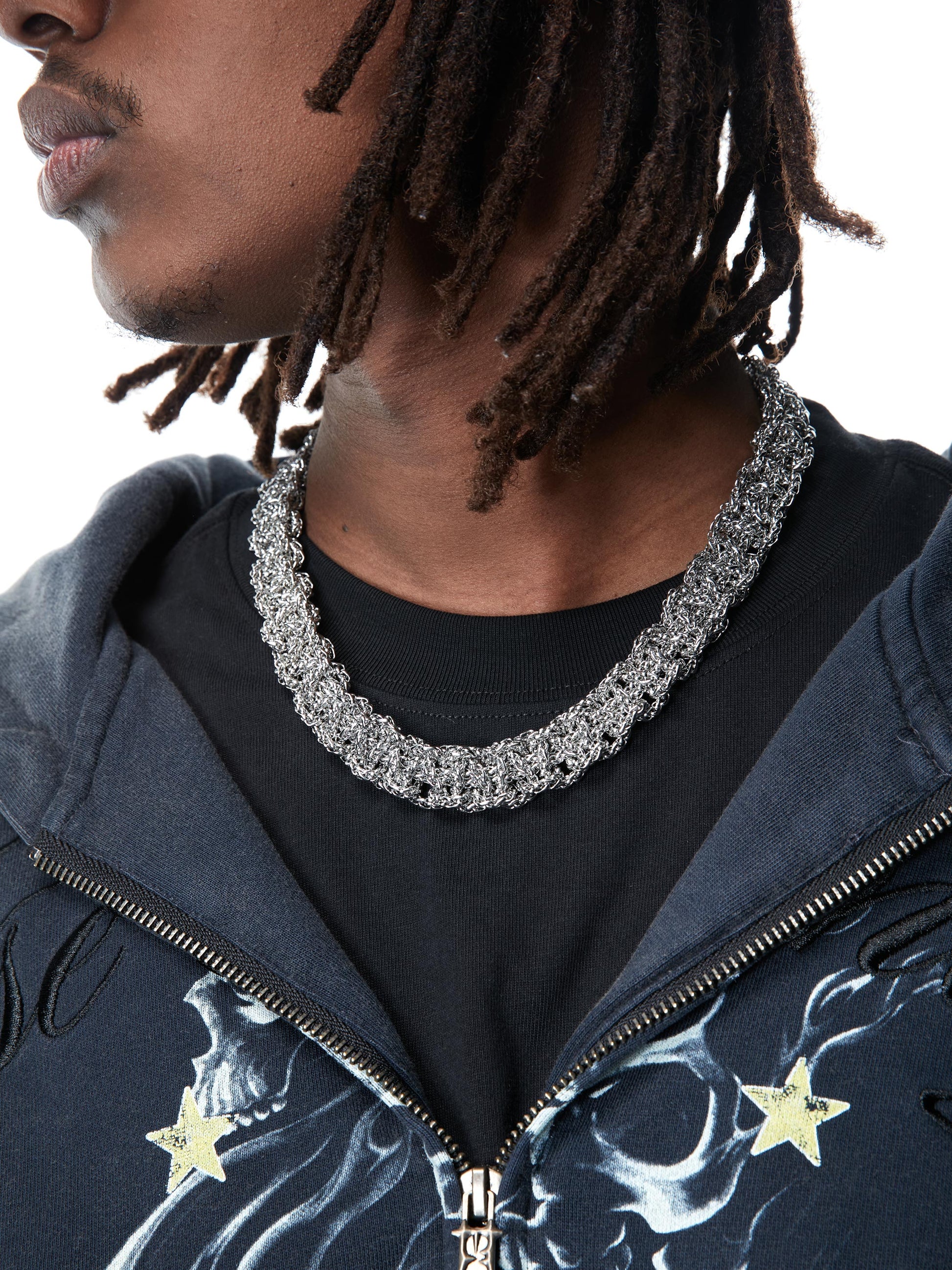 Handcrafted with a titanium-inspired finish over a durable alloy core and plated using precision rack techniques, this braided necklace features a tightly woven chain structure and four tassel links. The combination of raw structure and refined polishing gives the design a distinct sense of style and balance. Built to be rust-resistant, oxidative-resistant, and wear-resistant, it requires no maintenance and is made to last.