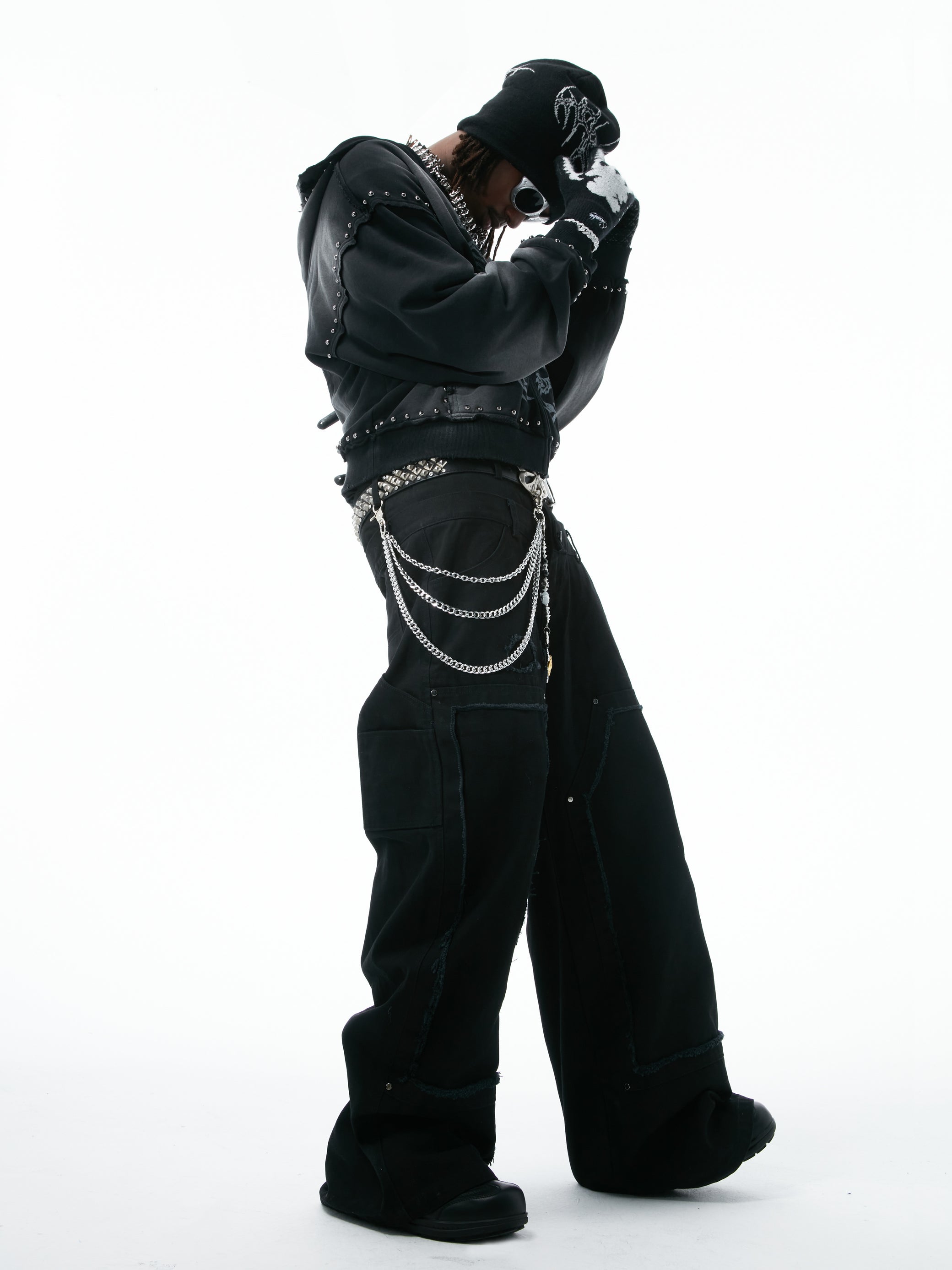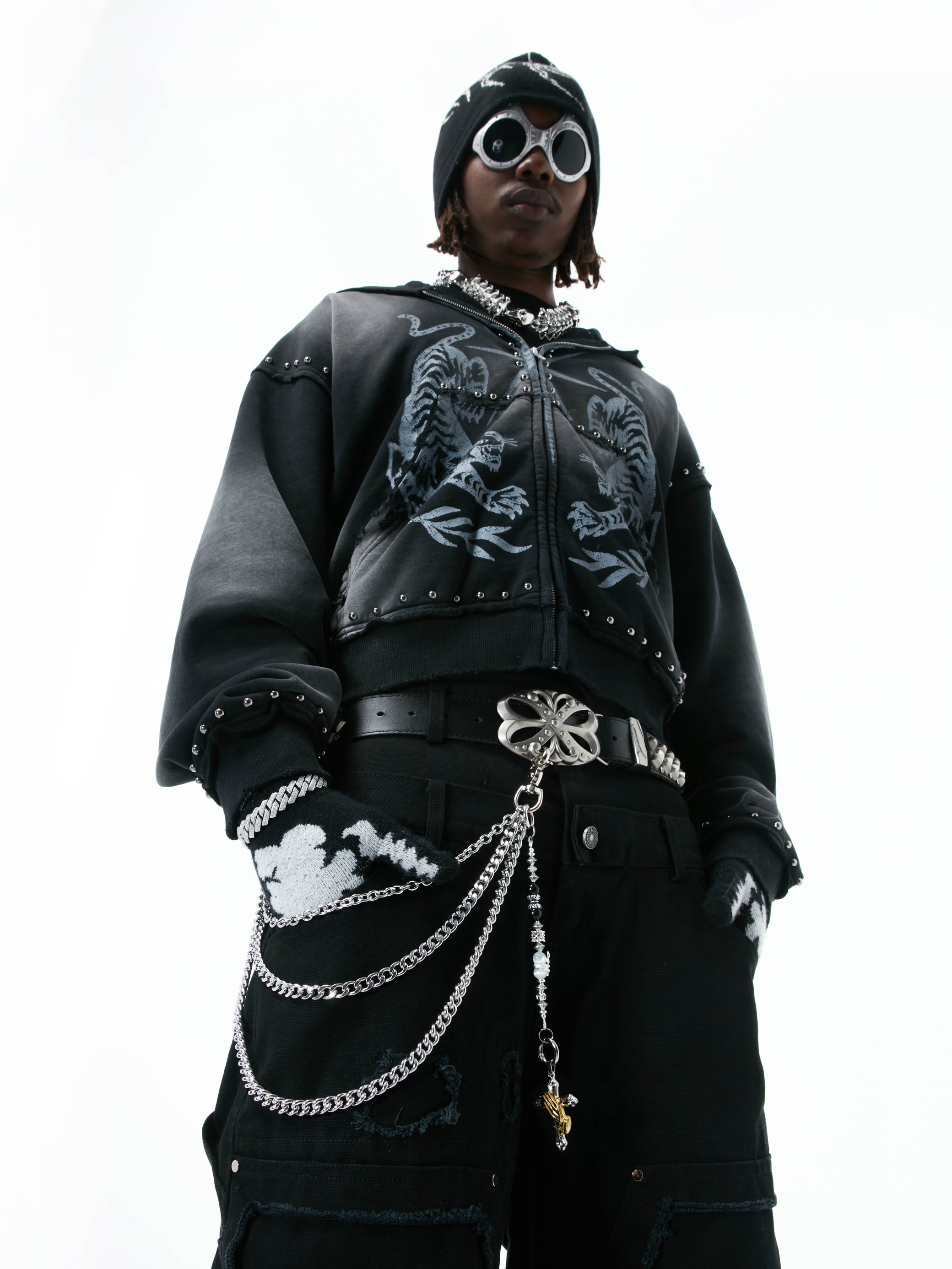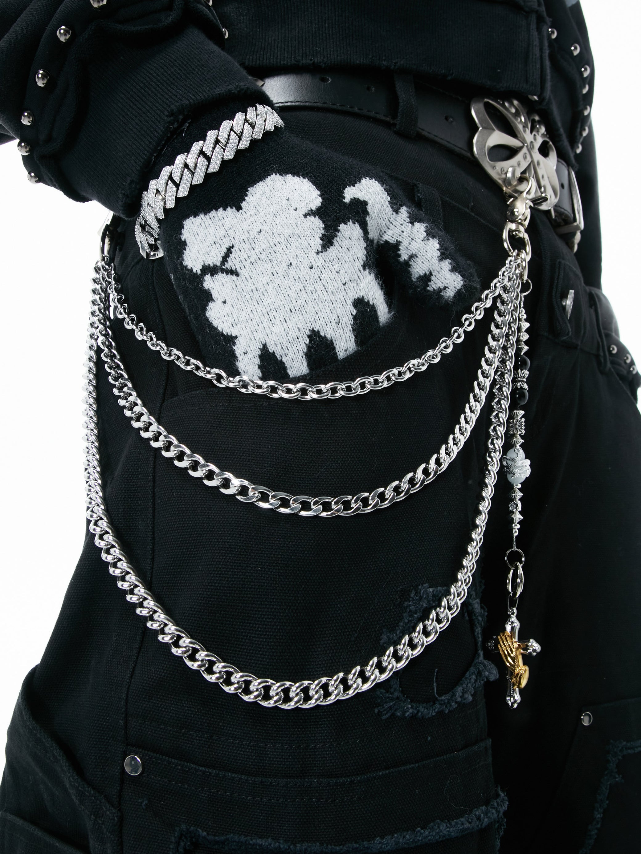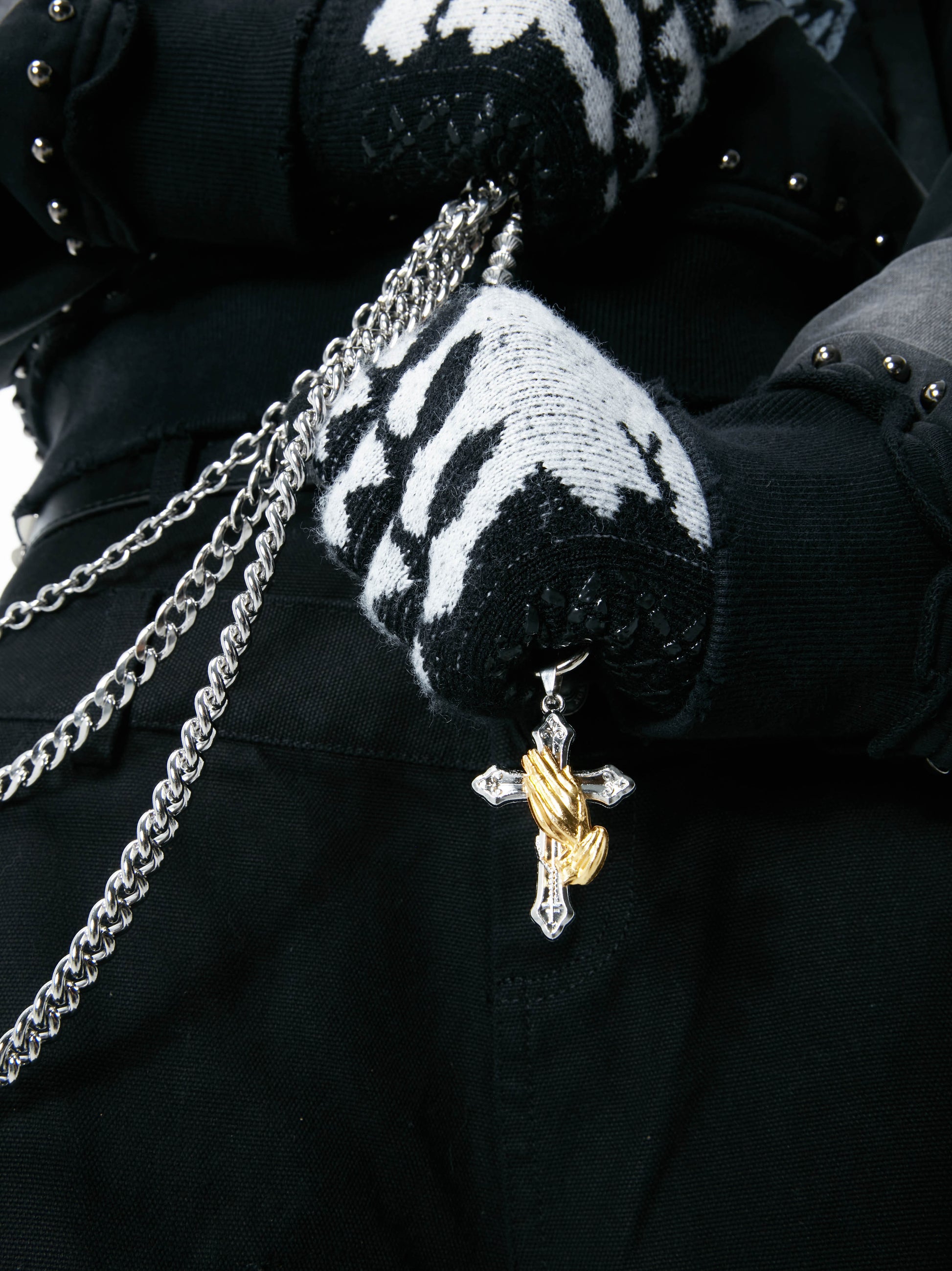 Crafted from high-durability titanium steel and designed by HOWSS, this piece resists rust, oxidation, and wear — no maintenance needed.Its triple-layered chain base combines raw texture with sculptural clarity, while symbolic crosses, praying hands, and coiled elements merge rebellion with reverence — each detail sharply defined with industrial edge.