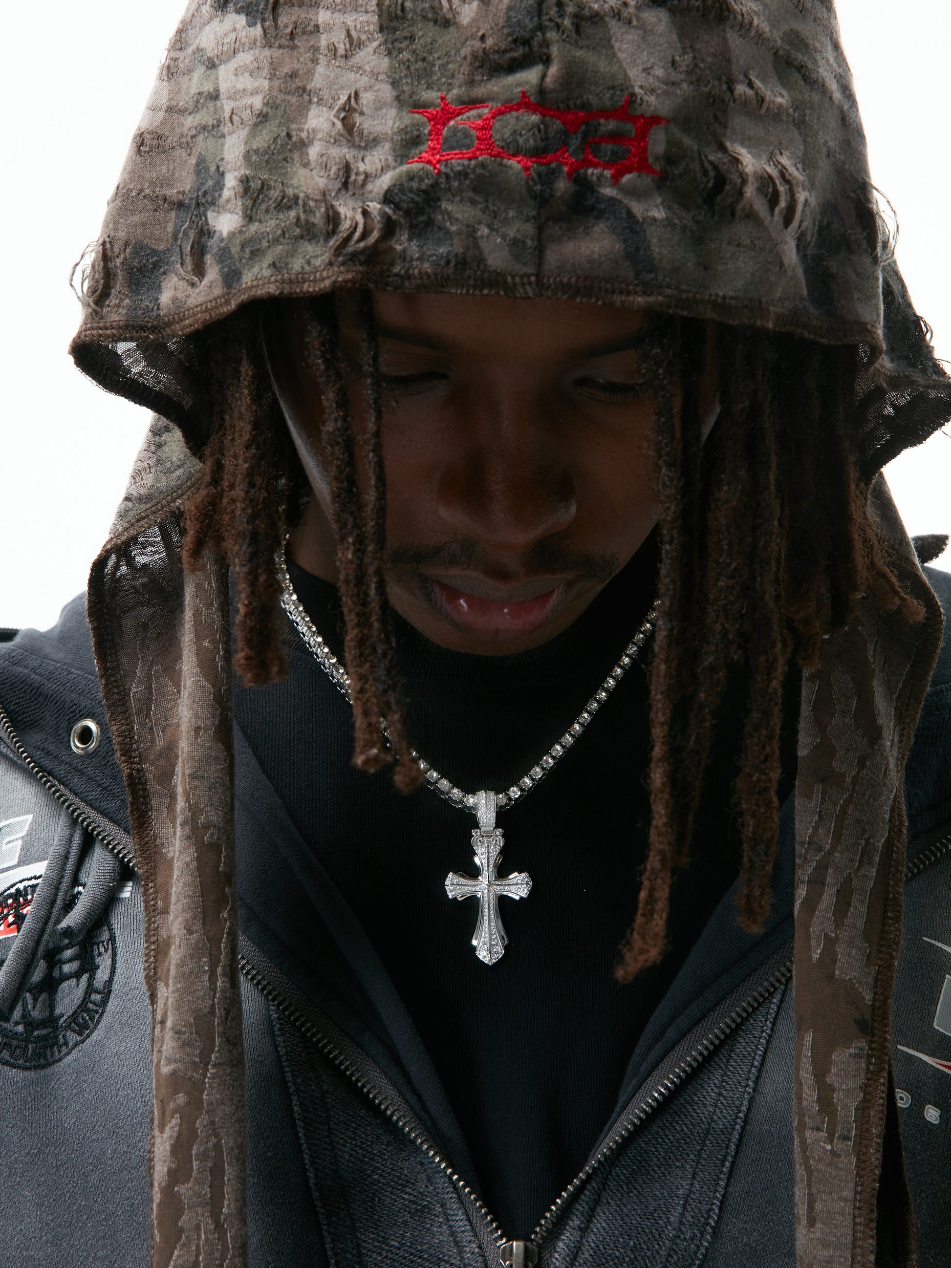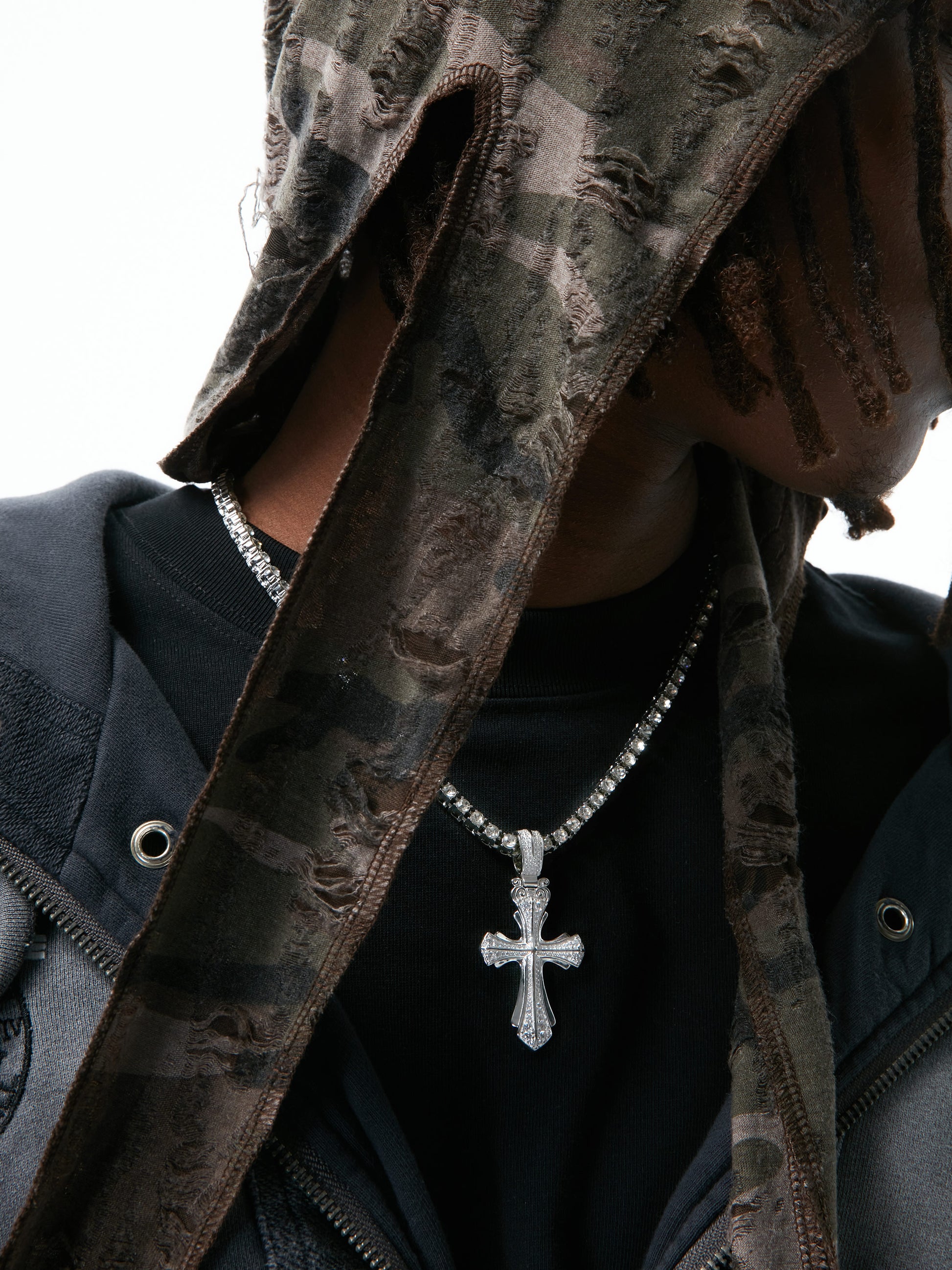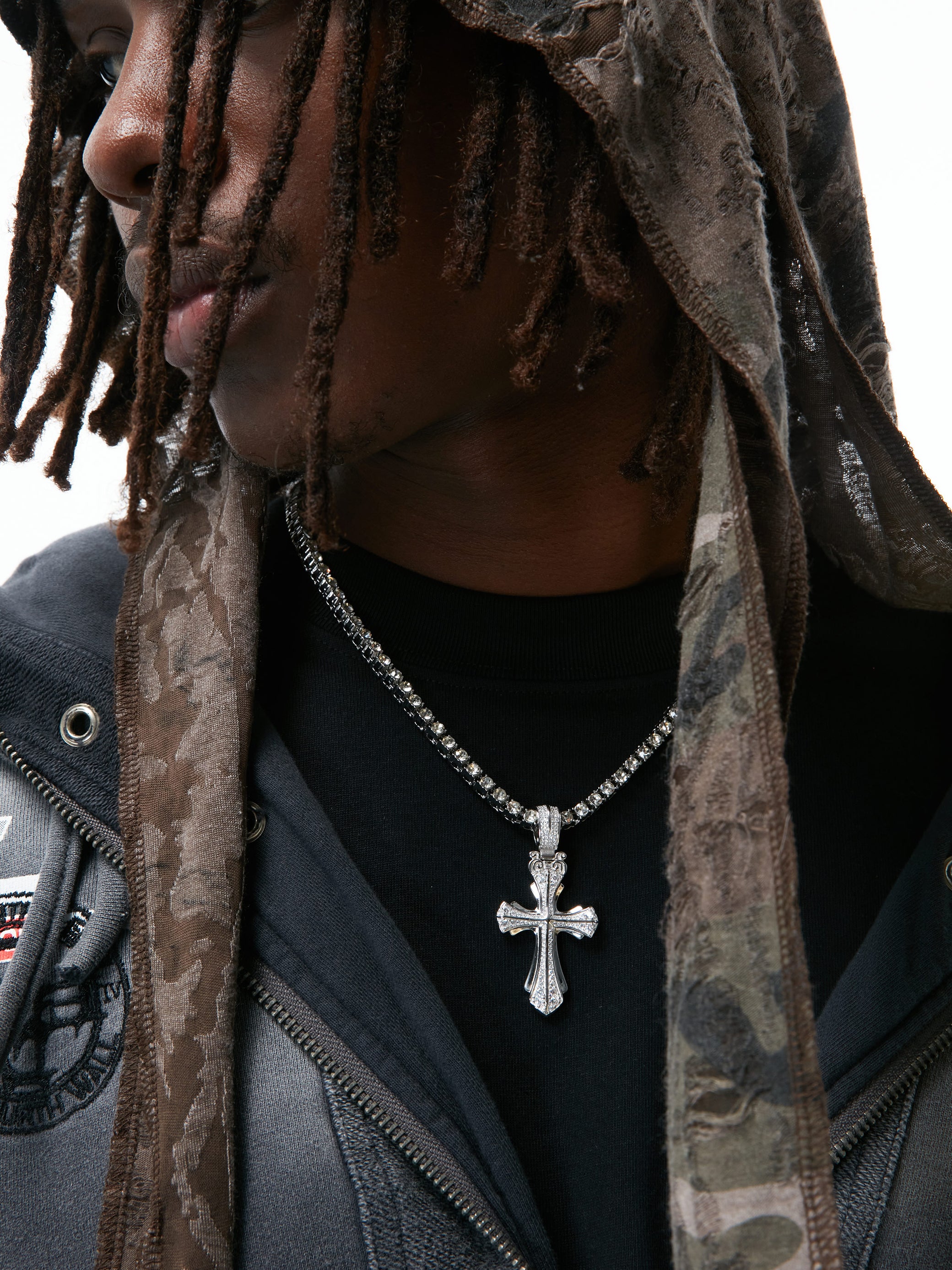 Handcrafted from solid 925 silver, this pendant necklace reimagines the classic cross with modern precision. The pendant is fully sculpted and micro-pavé set with high-grade zirconia stones, capturing light with controlled brilliance. It’s paired with a polished chain adorned with reflective stone-set details—delivering a clean, elevated shine without excess. A piece designed to balance spiritual intensity with refined street elegance.