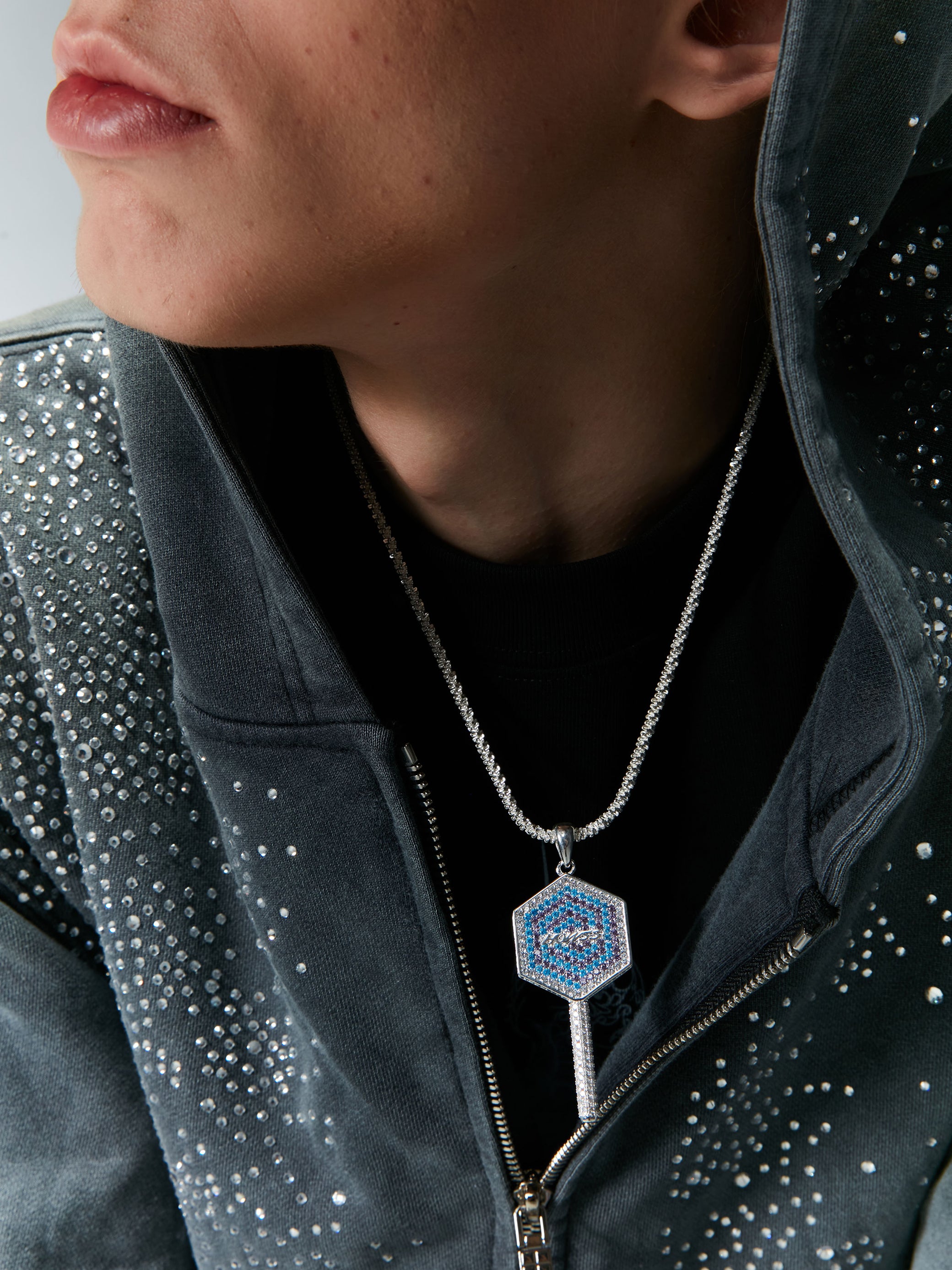 Pendant crafted from silver-plated brass, fully handset with high-brilliance cubic zirconia. The hexagonal face carries gradient shimmer, finished with a stick-shaped drop tail that recalls a lollipop.