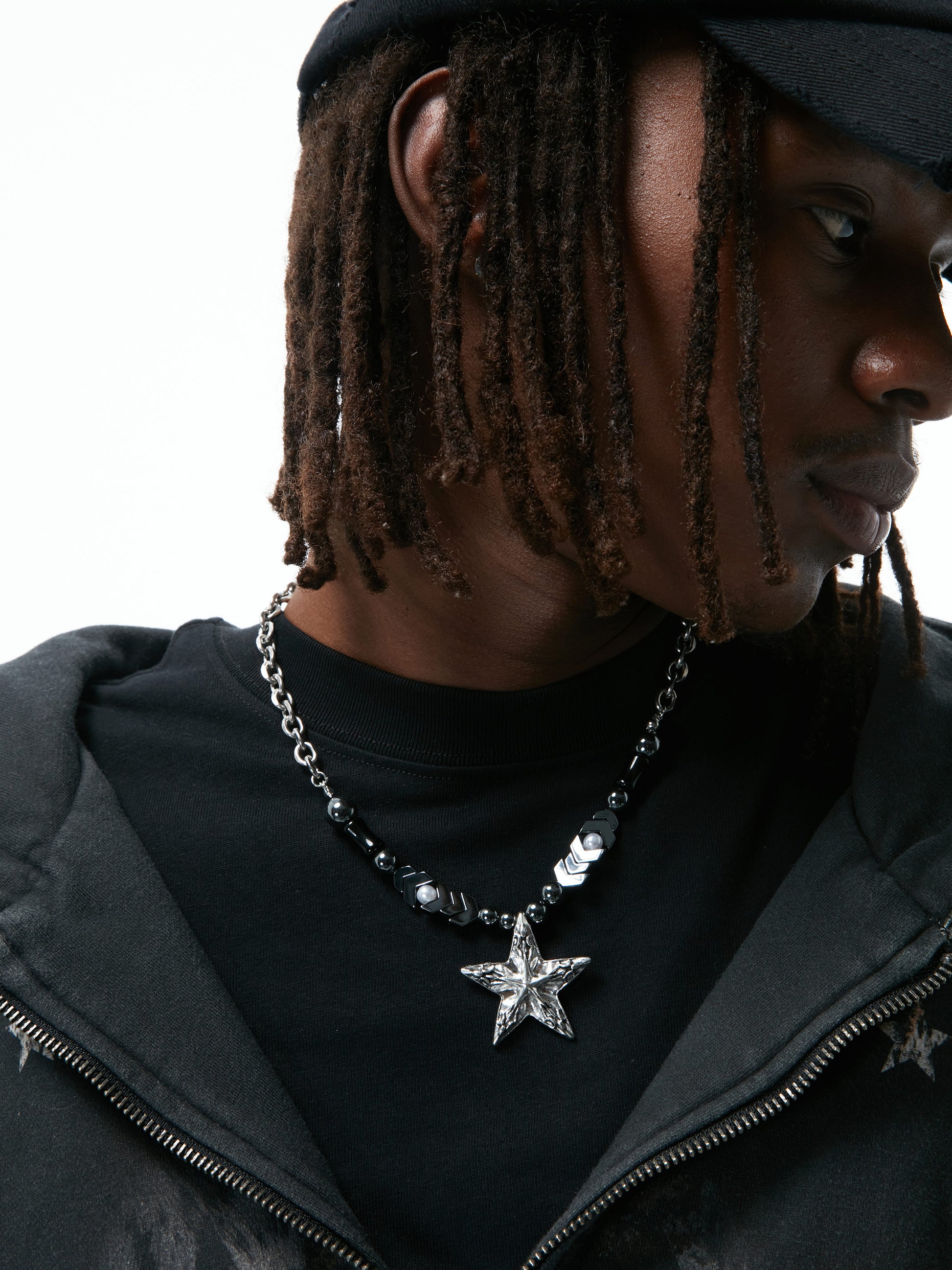 This unique piece is handcrafted from high-quality titanium steel for a raw, industrial feel. Its electroplated surface accentuates the deep black luster of the agate stone, creating a stunning play of light and shadow. The piece is flexible in design and features a unique five-pointed star pendant. It is resistant to rust and oxidation, making it durable and maintenance-free.