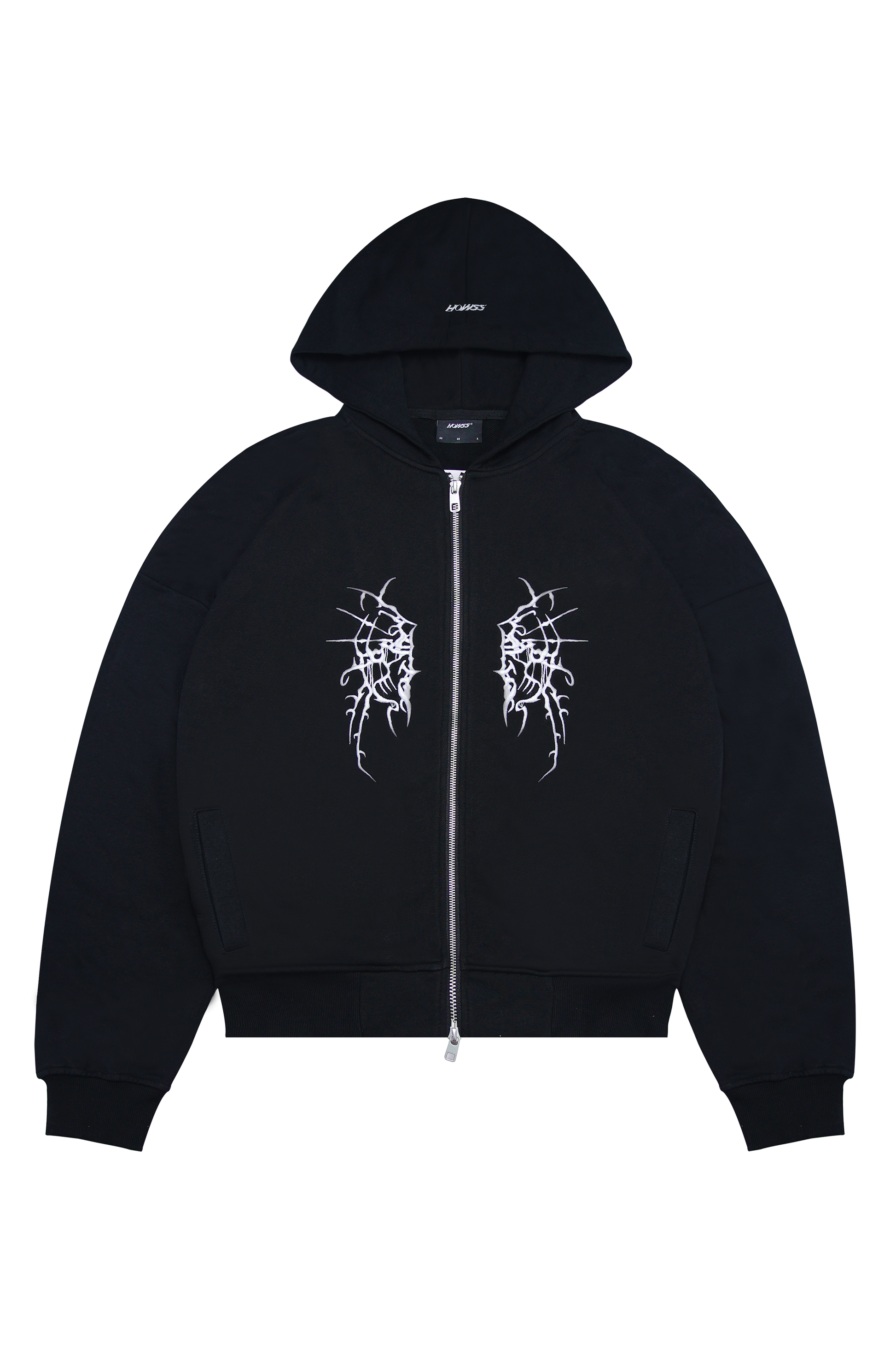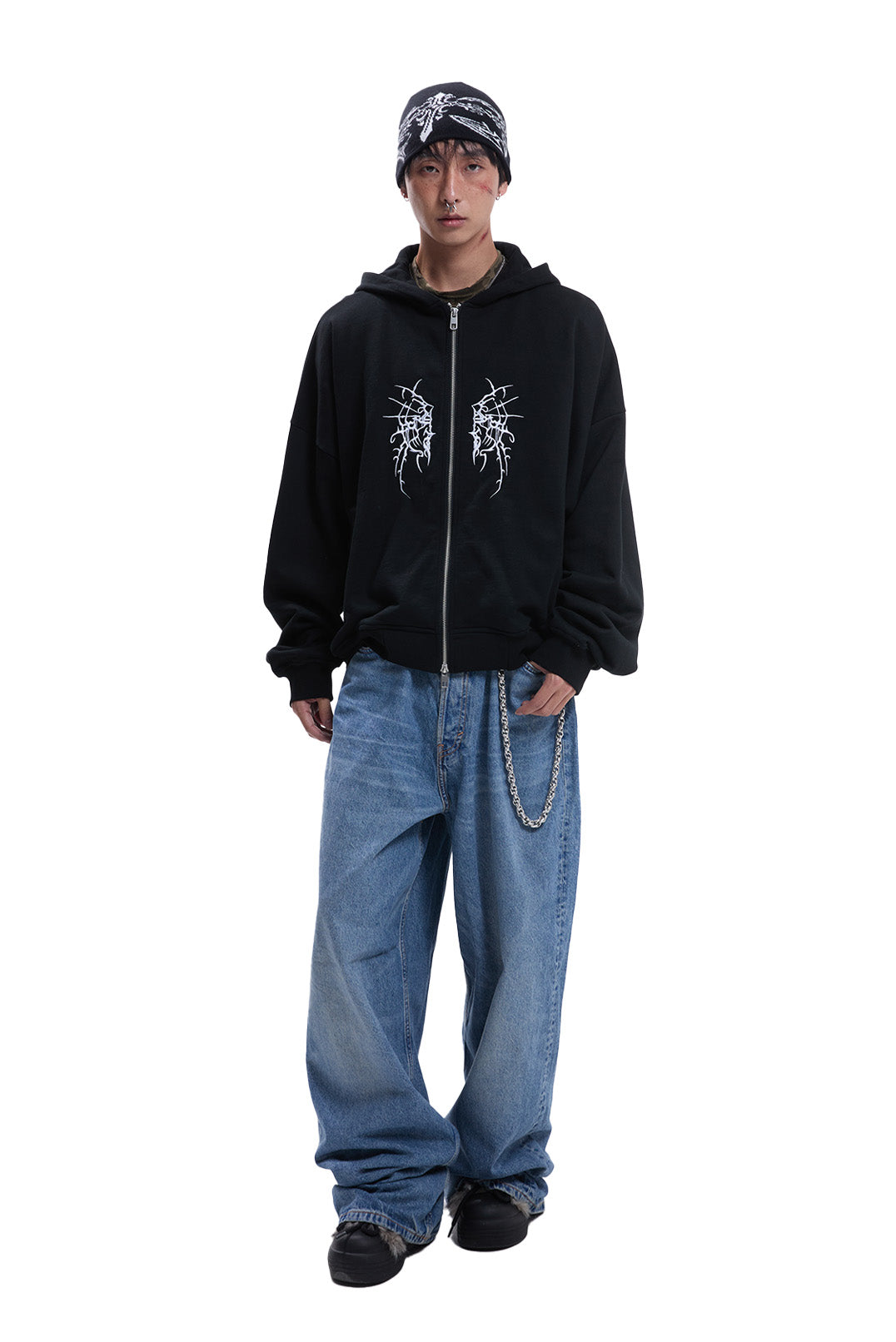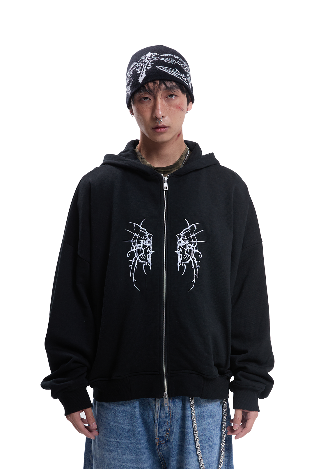 The embroidered spider pattern on the chest whispers like a warrior's armor in the dark. The intricate craftsmanship gives it life, with every thread revealing resilience and mystery.