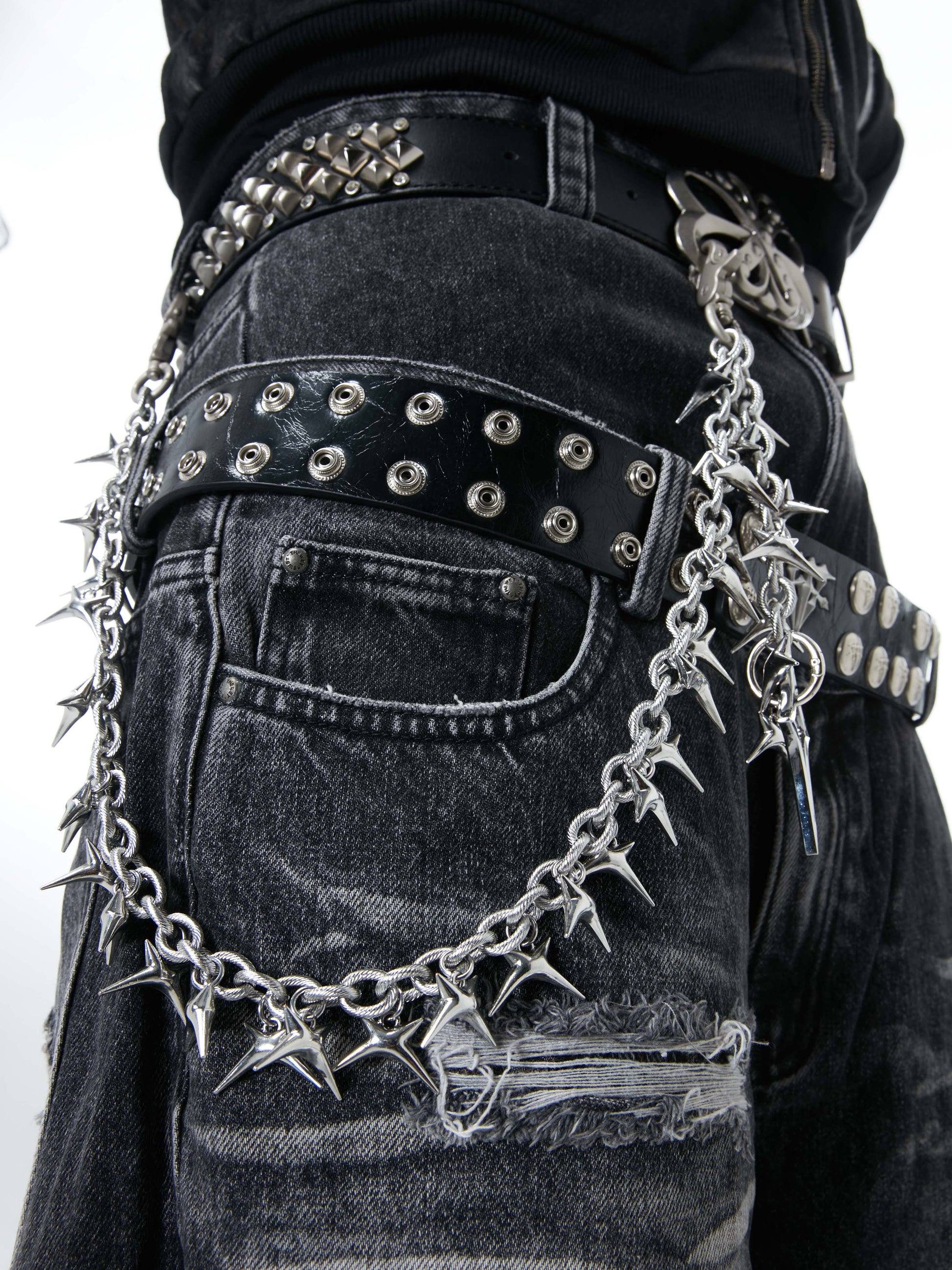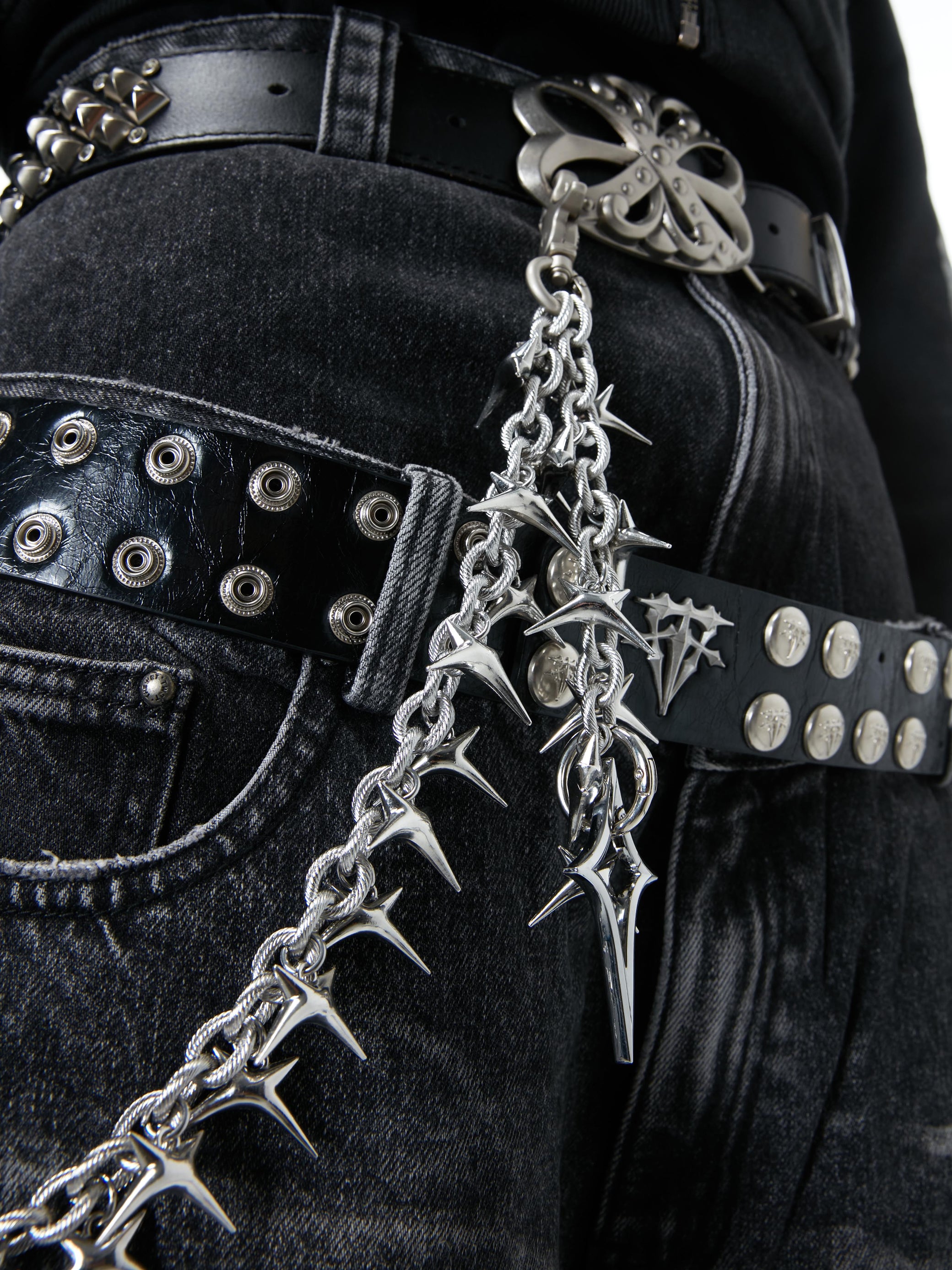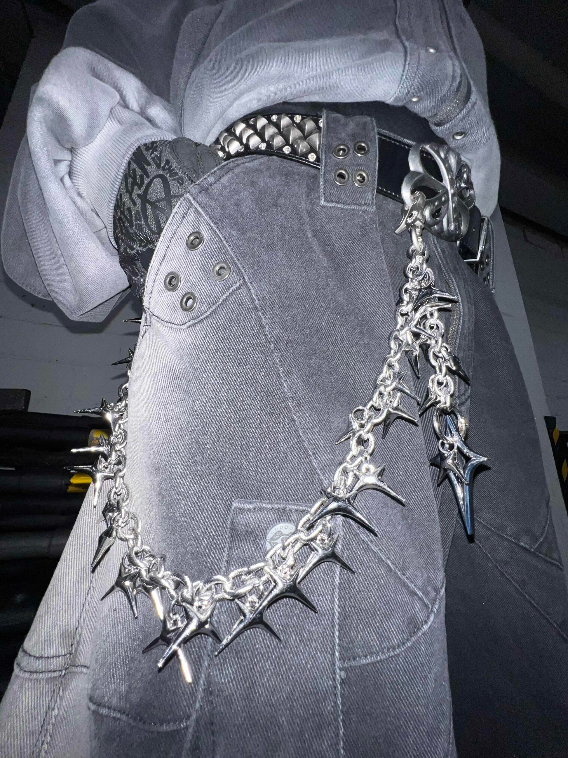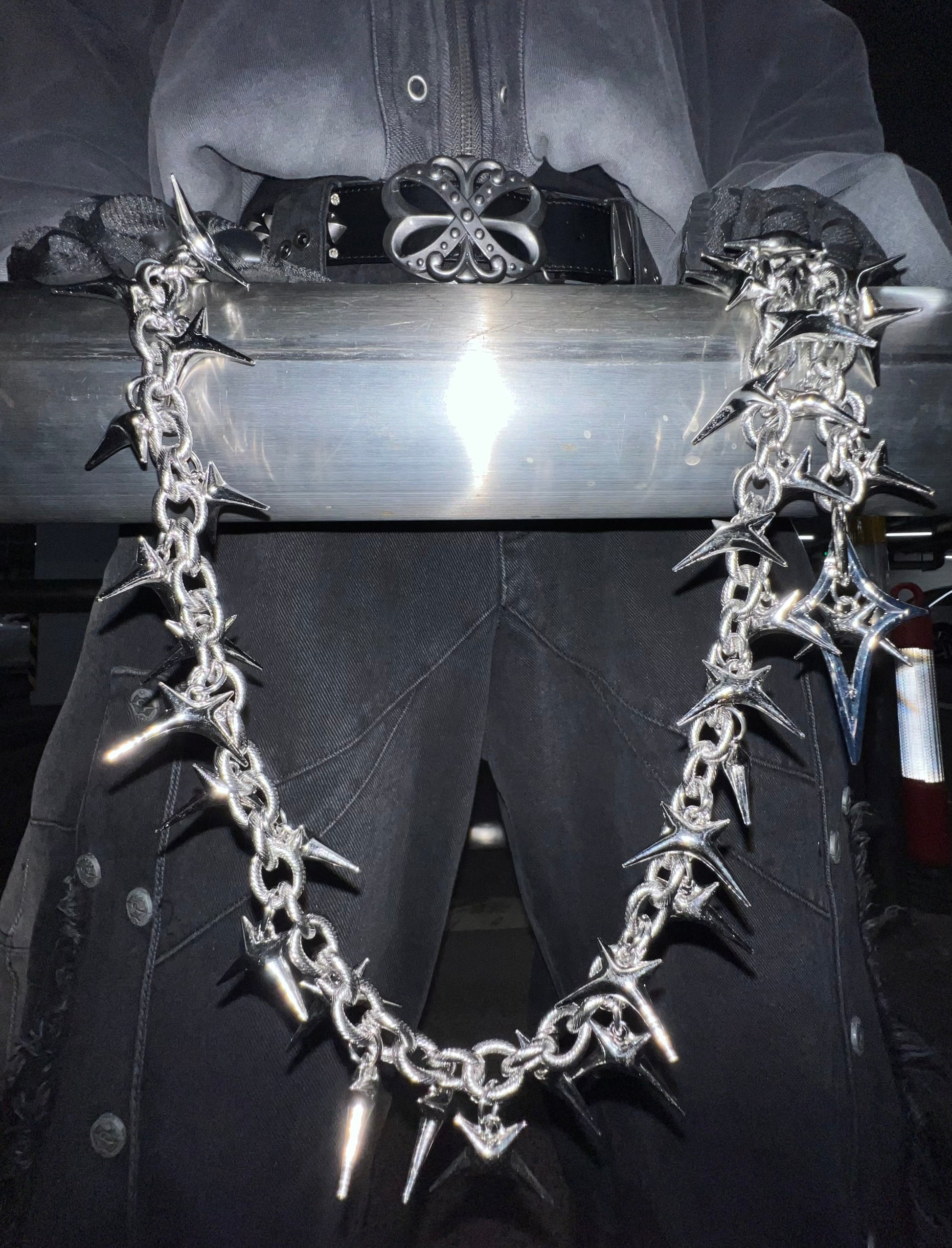 Constructed with a stainless steel chain and high-grade alloy spikes, combining strength with edge. Each segment is hand-assembled and polished for balance and durability — solid, reflective, and made to withstand time.