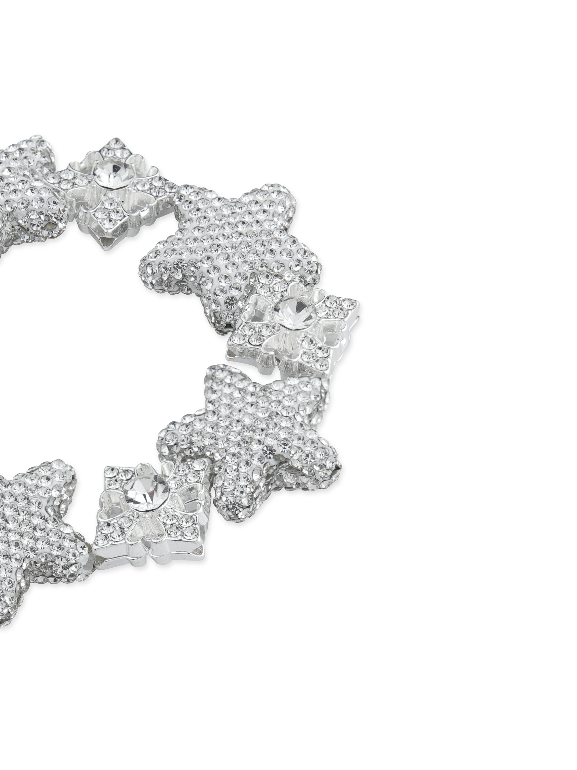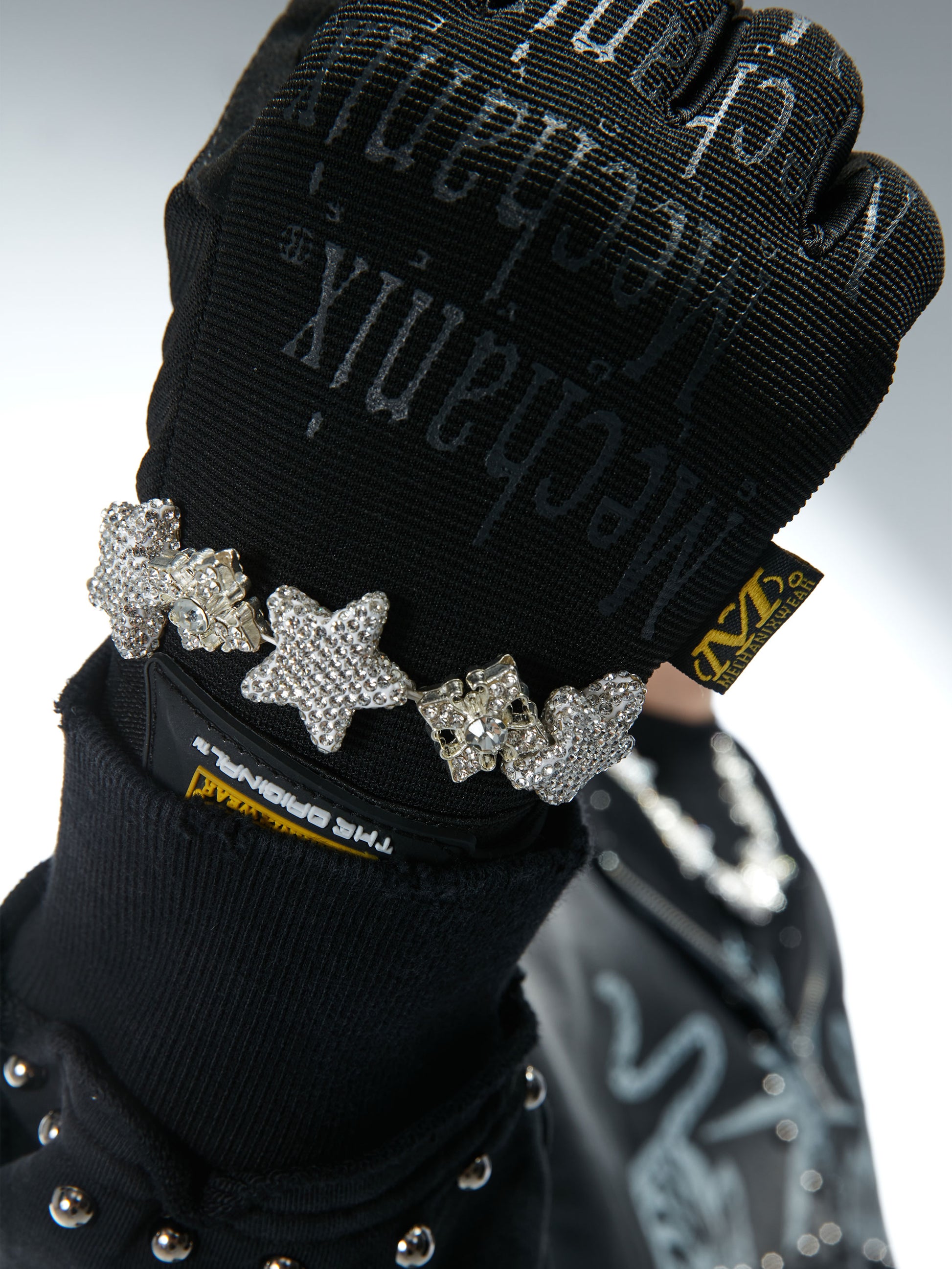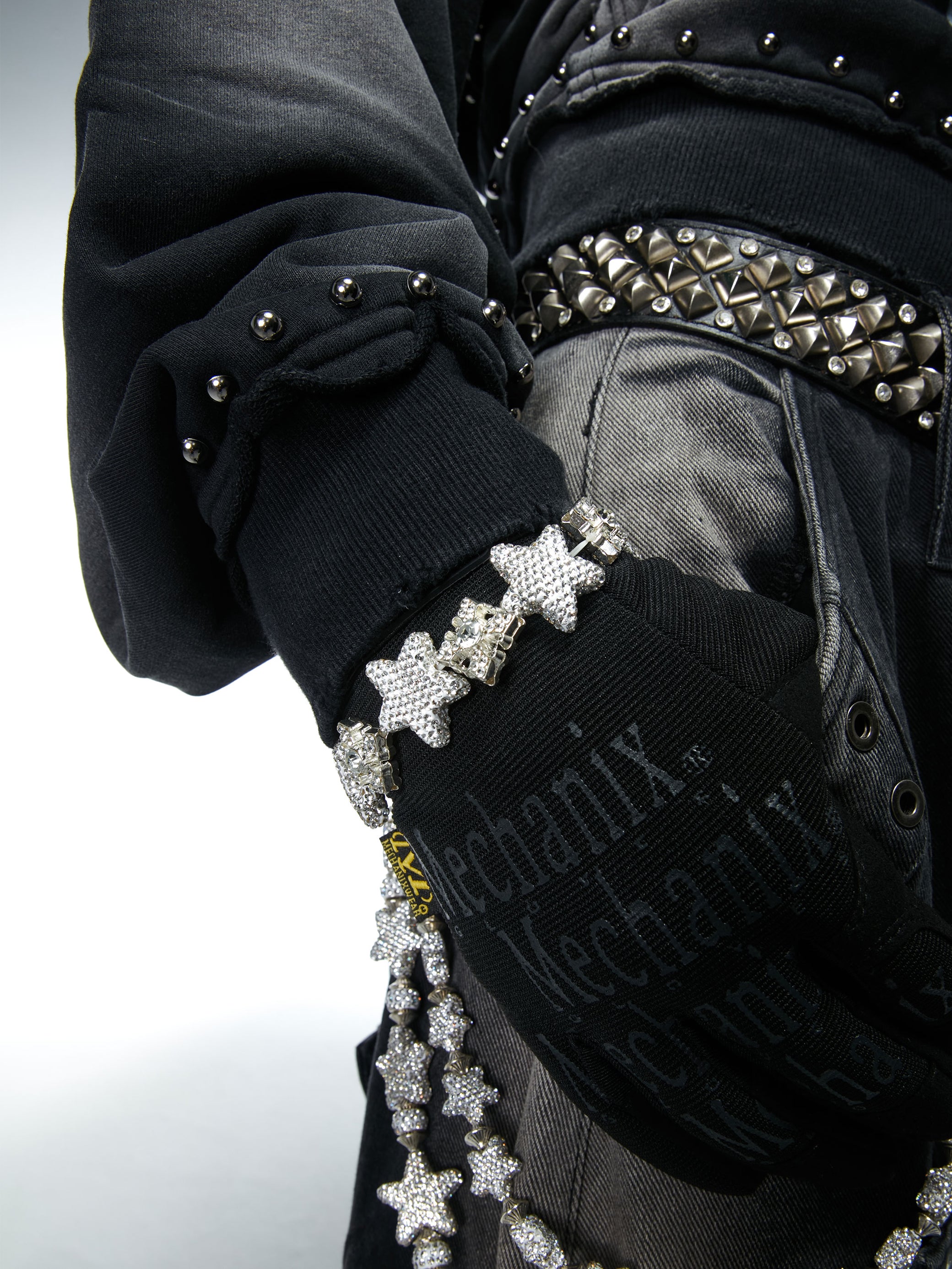 Each star-shaped link is hand-set with optical-grade resin, cut for high reflectivity and sharp shine. Link pieces are alloy-cast with a polished finish, forming a chain that balances shine, texture, and structure.