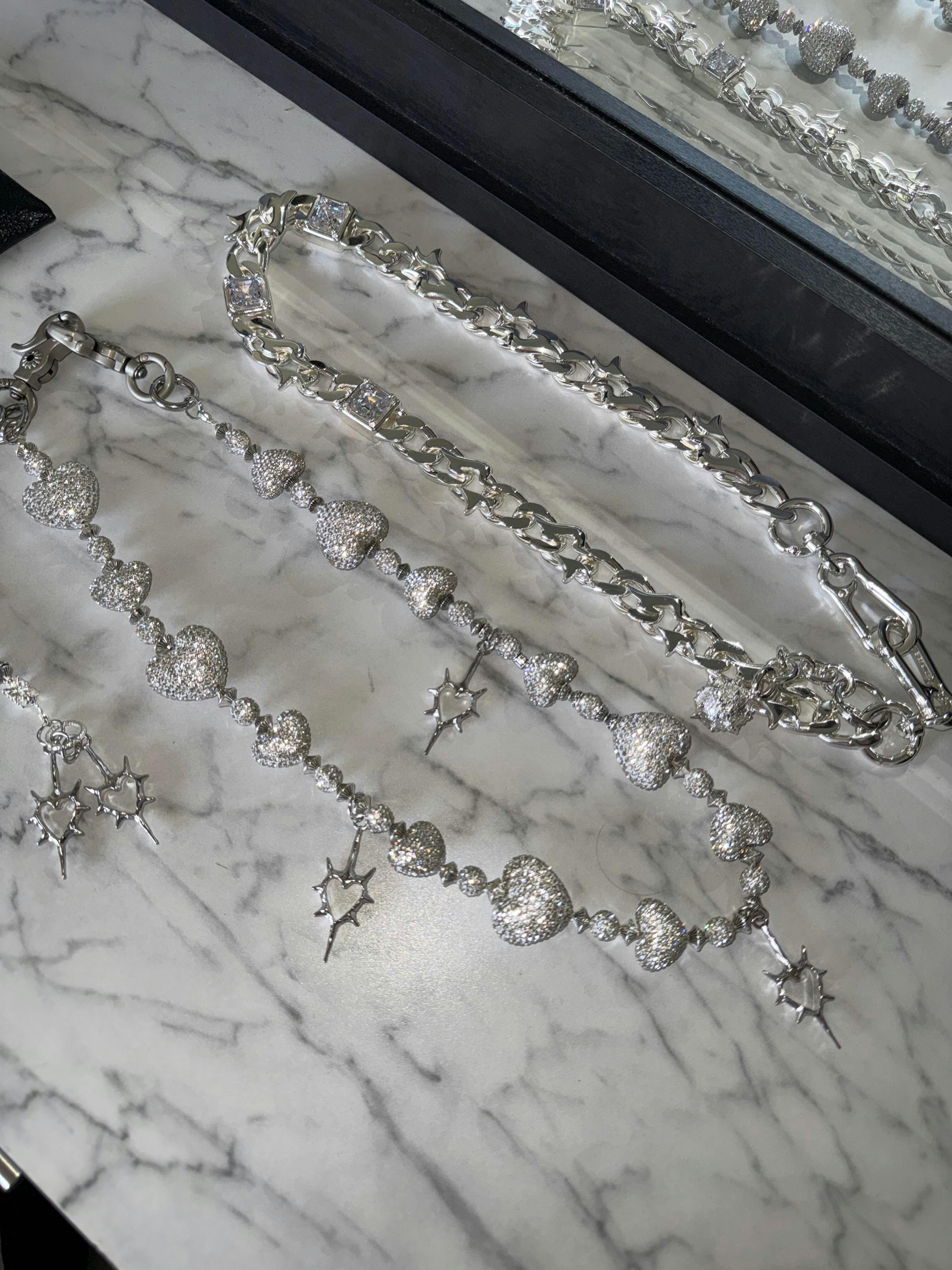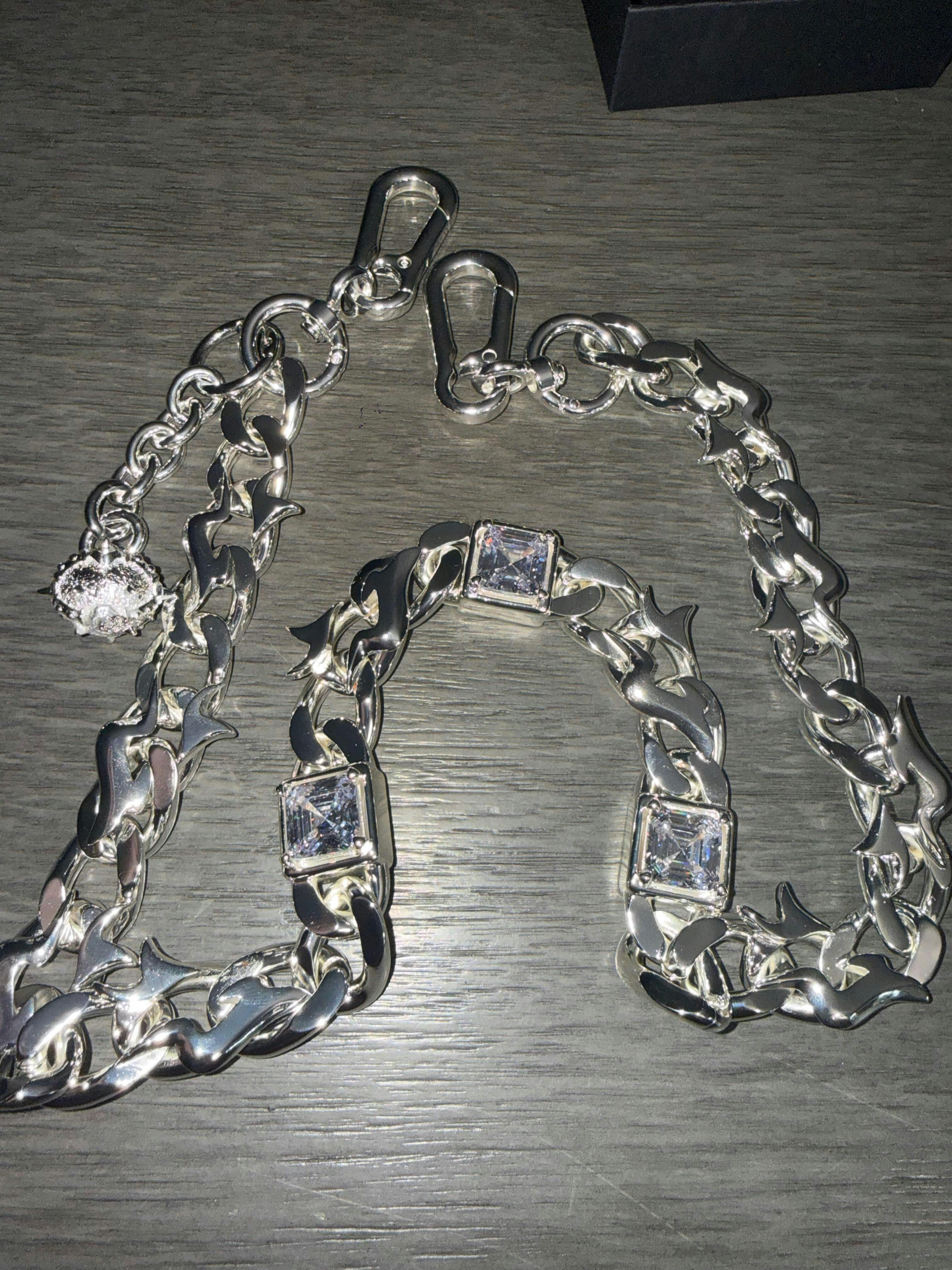 Built from copper with a silver-plated finish, this chain holds both weight and presence. Three Asscher-cut square zircon stones are precision-set into the flame-link body, throwing deep, mirror-like flashes with every move. Finished with a side-mounted warhammer pendant for a sharp, commanding edge.