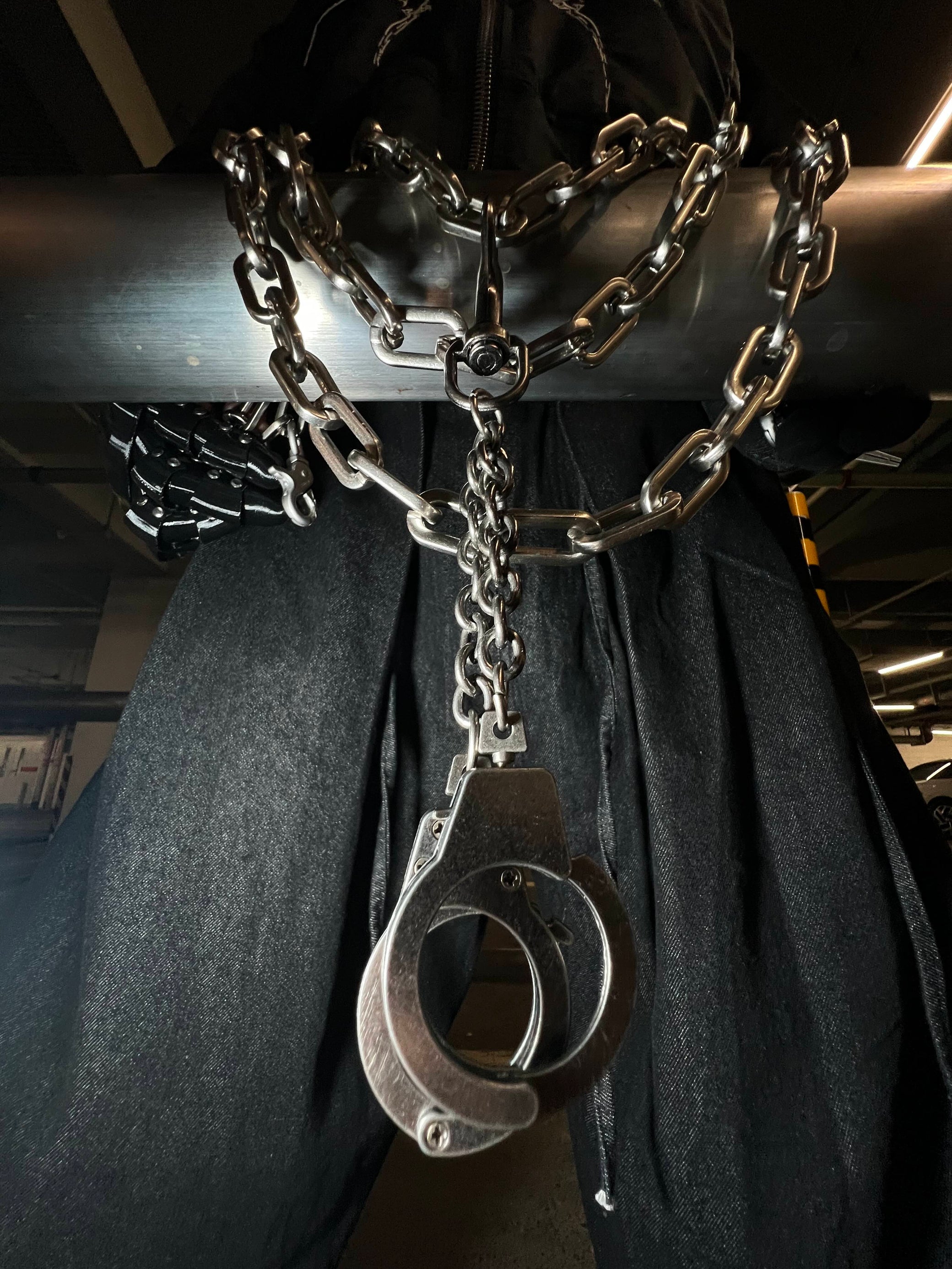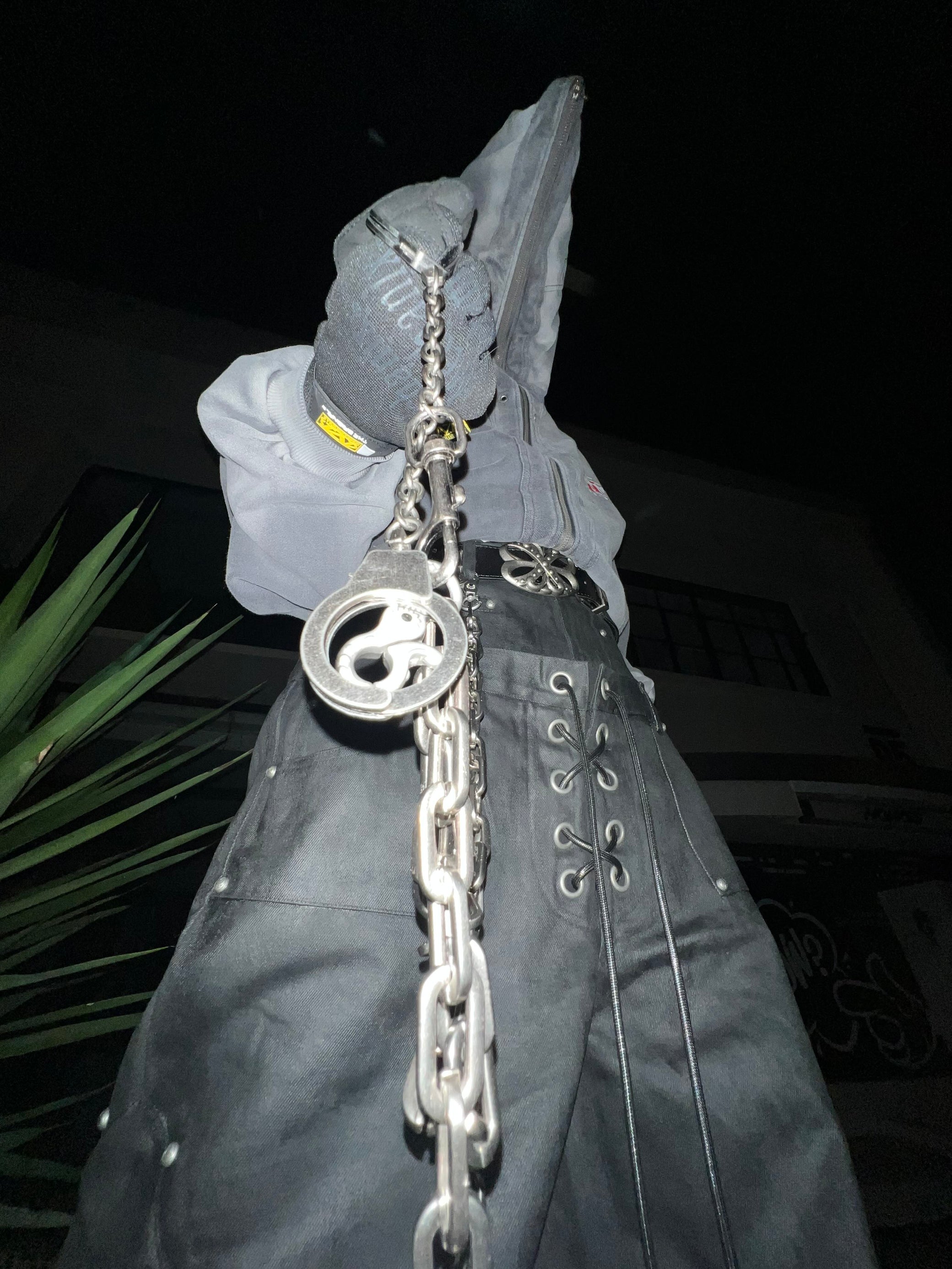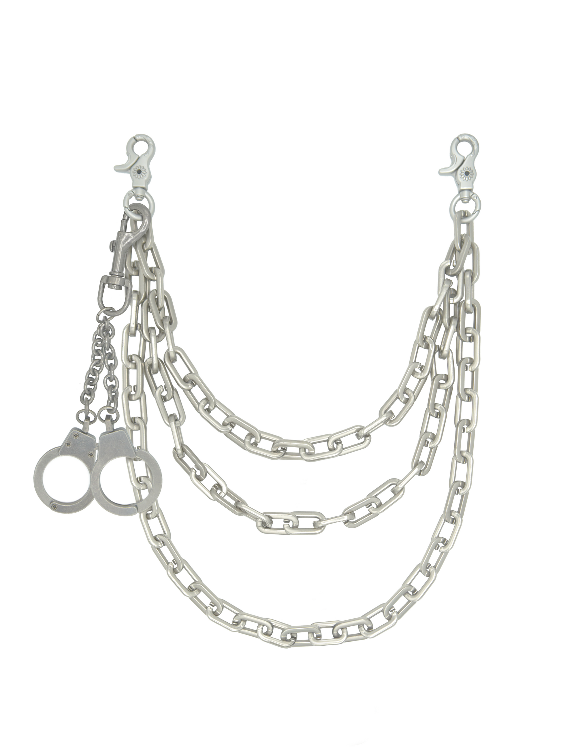 Made from high-density zinc alloy with gunmetal finishing. Each segment is individually linked and reinforced for structural weight and endurance.The handcuff pendant is crafted for texture and realism, adding a utilitarian edge to the overall form.