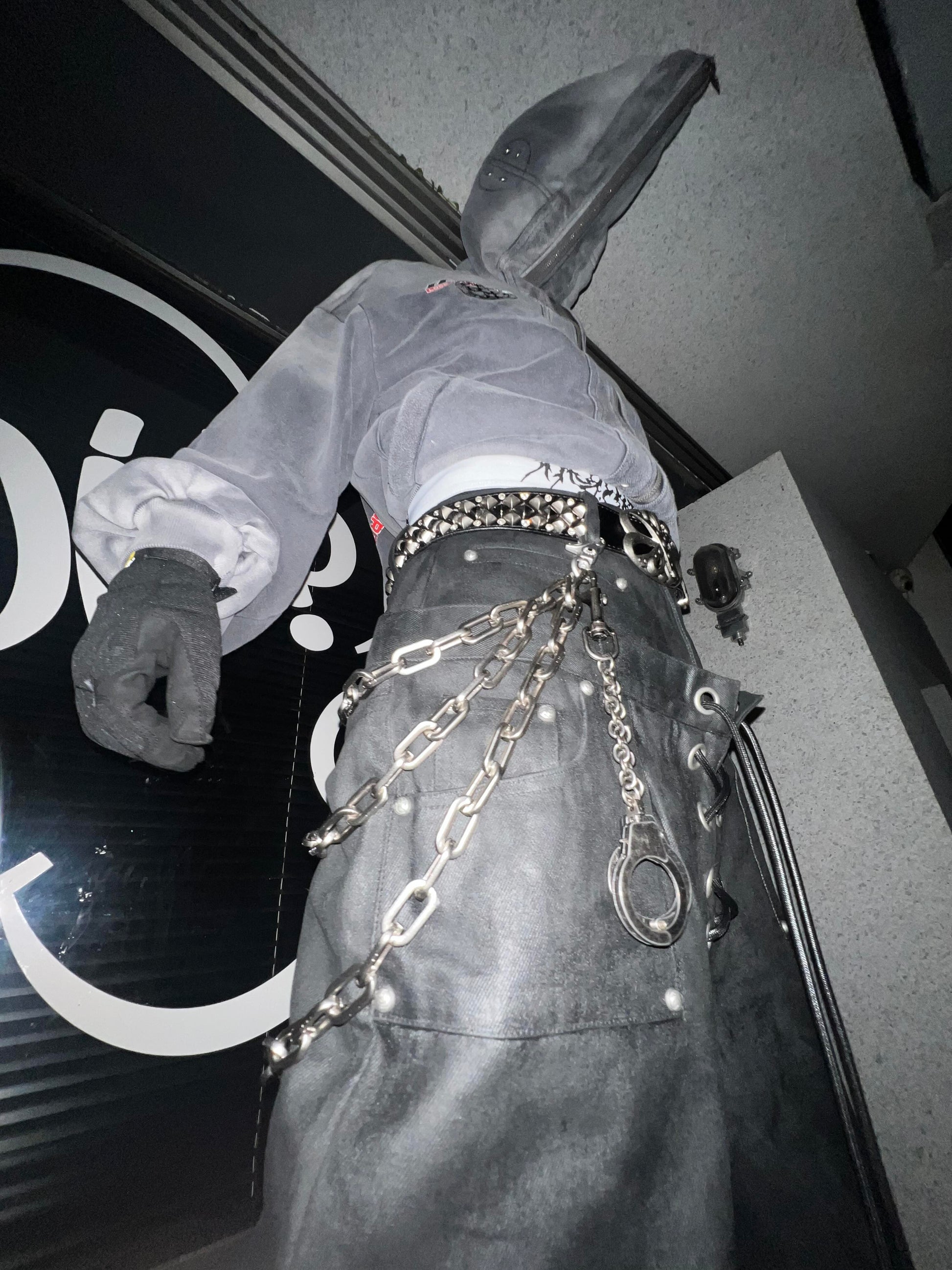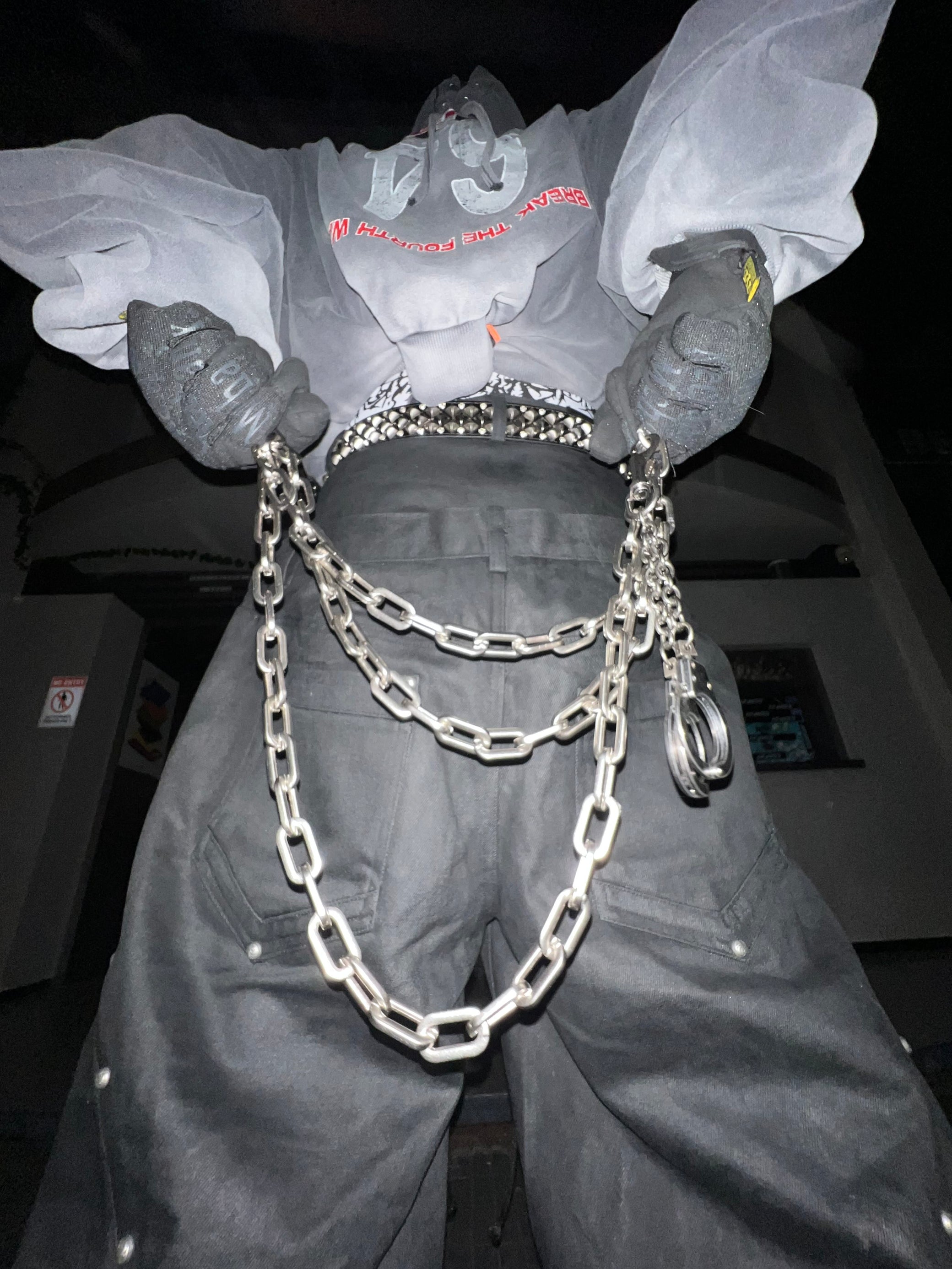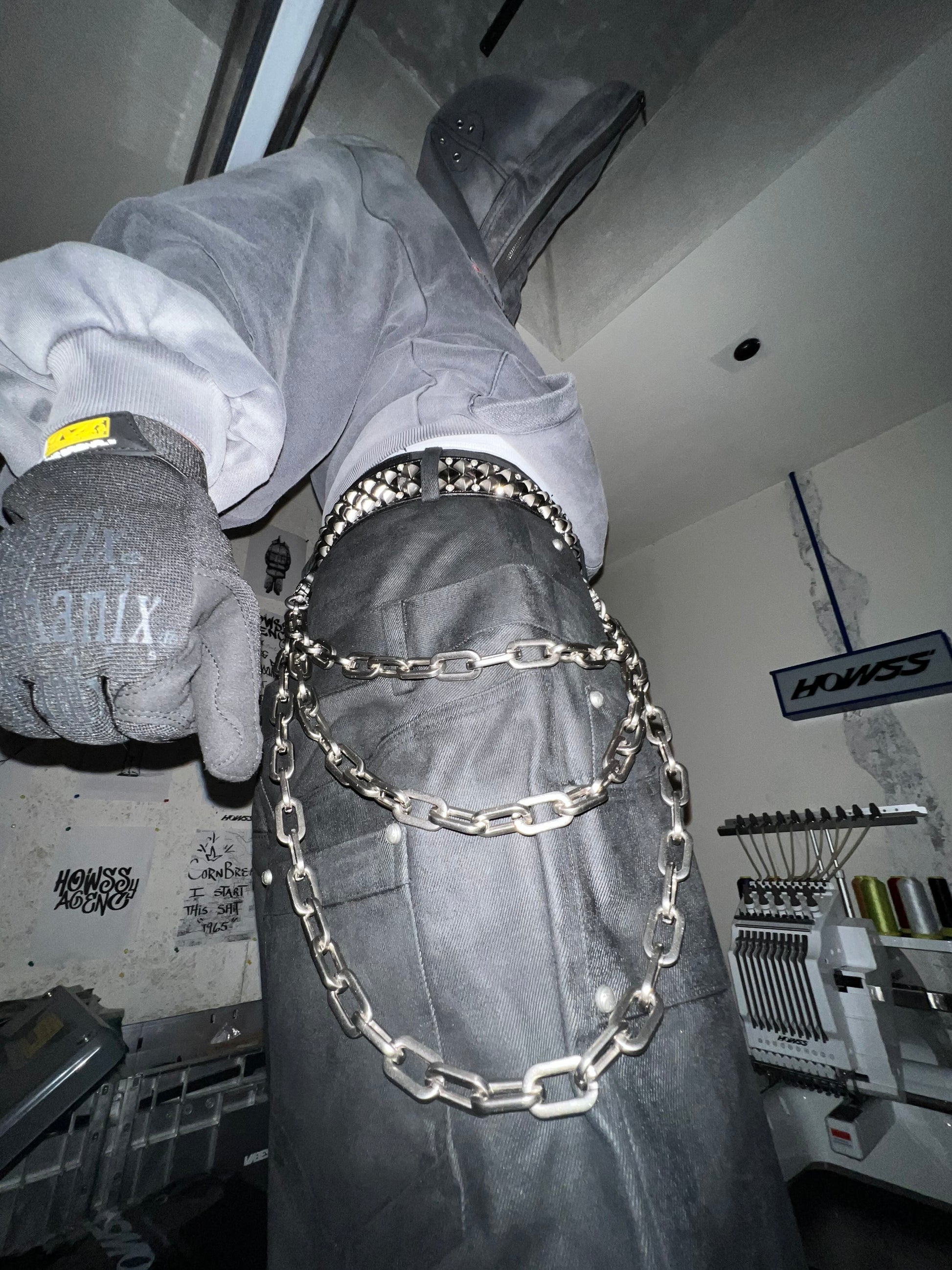 Made from high-density zinc alloy with gunmetal finishing. Each segment is individually linked and reinforced for structural weight and endurance.The handcuff pendant is crafted for texture and realism, adding a utilitarian edge to the overall form.
