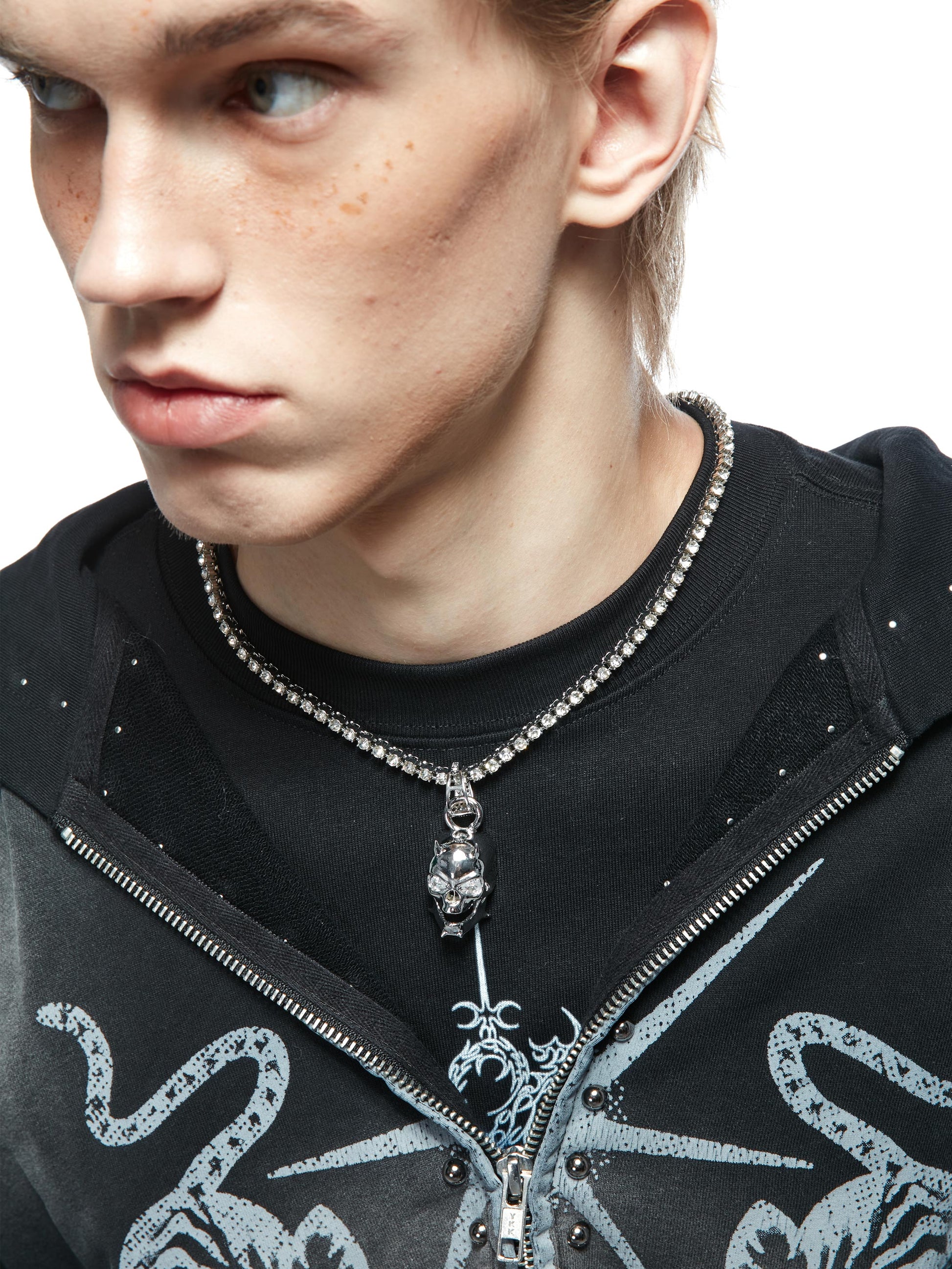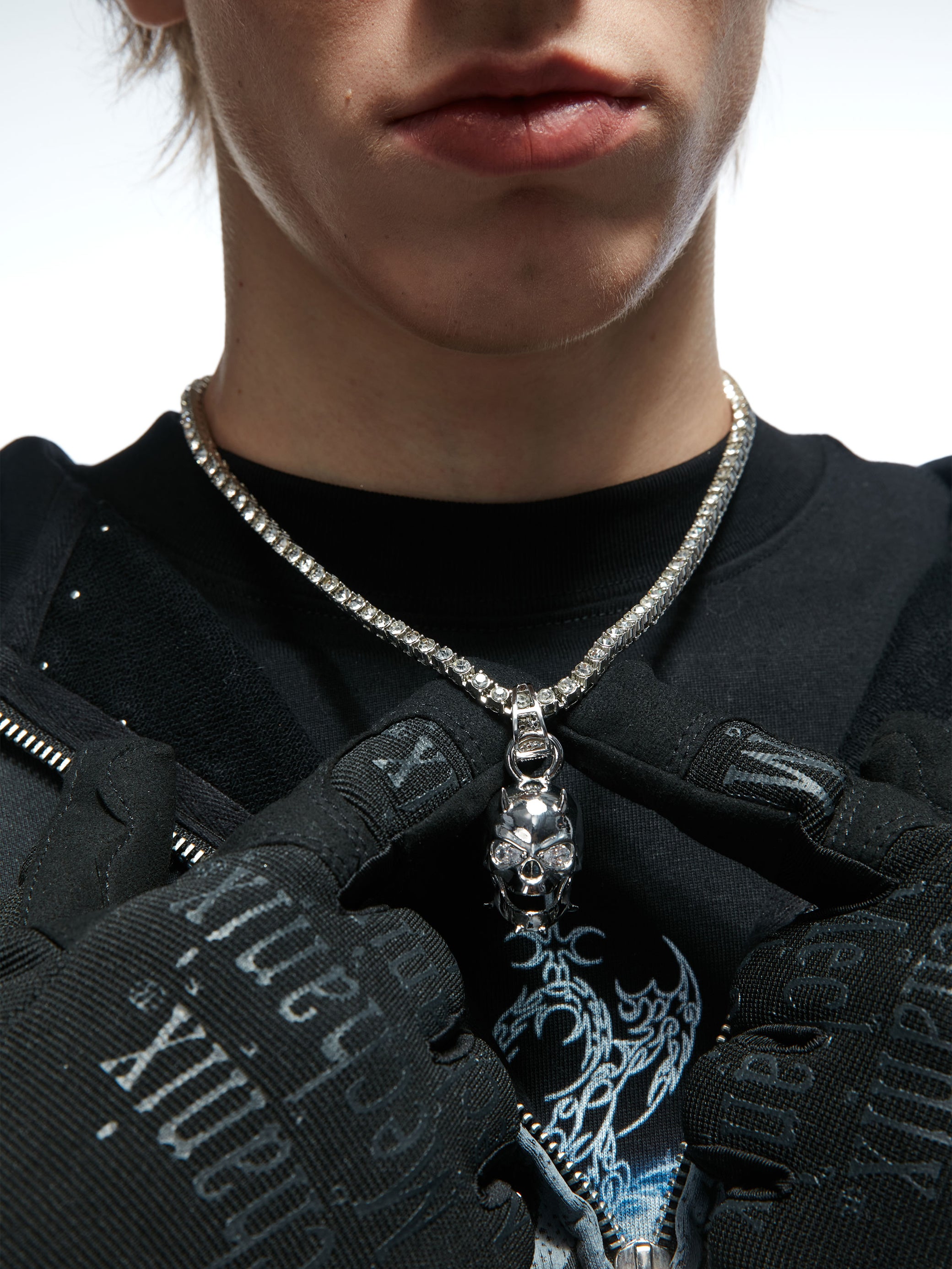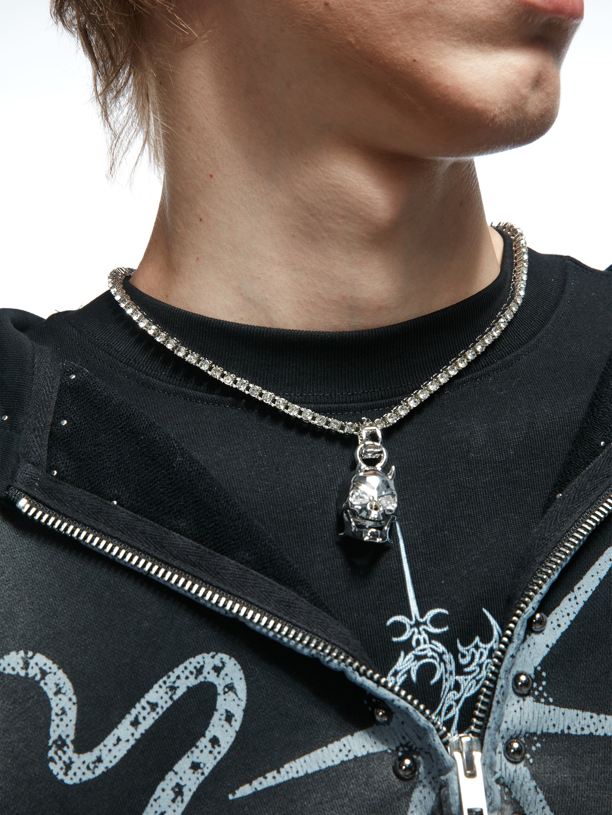 The skull pendant is available in two material options: high-grade brass electroplated in white gold for a bold, luminous finish, or solid 925 sterling silver for a purer, more enduring brilliance. The chain is a high-shine tennis-style line fully set with lab-cut cubic zirconia, delivering crisp brilliance in motion. Engineered for both impact and longevity.