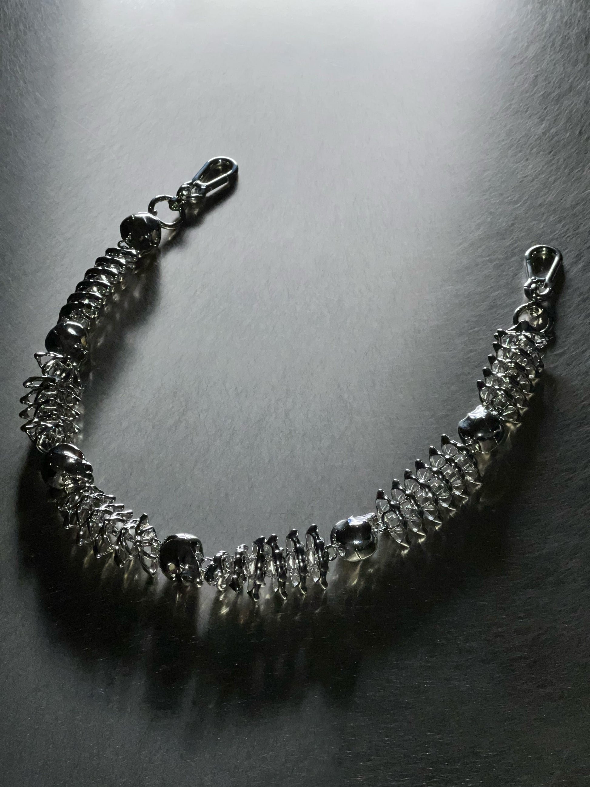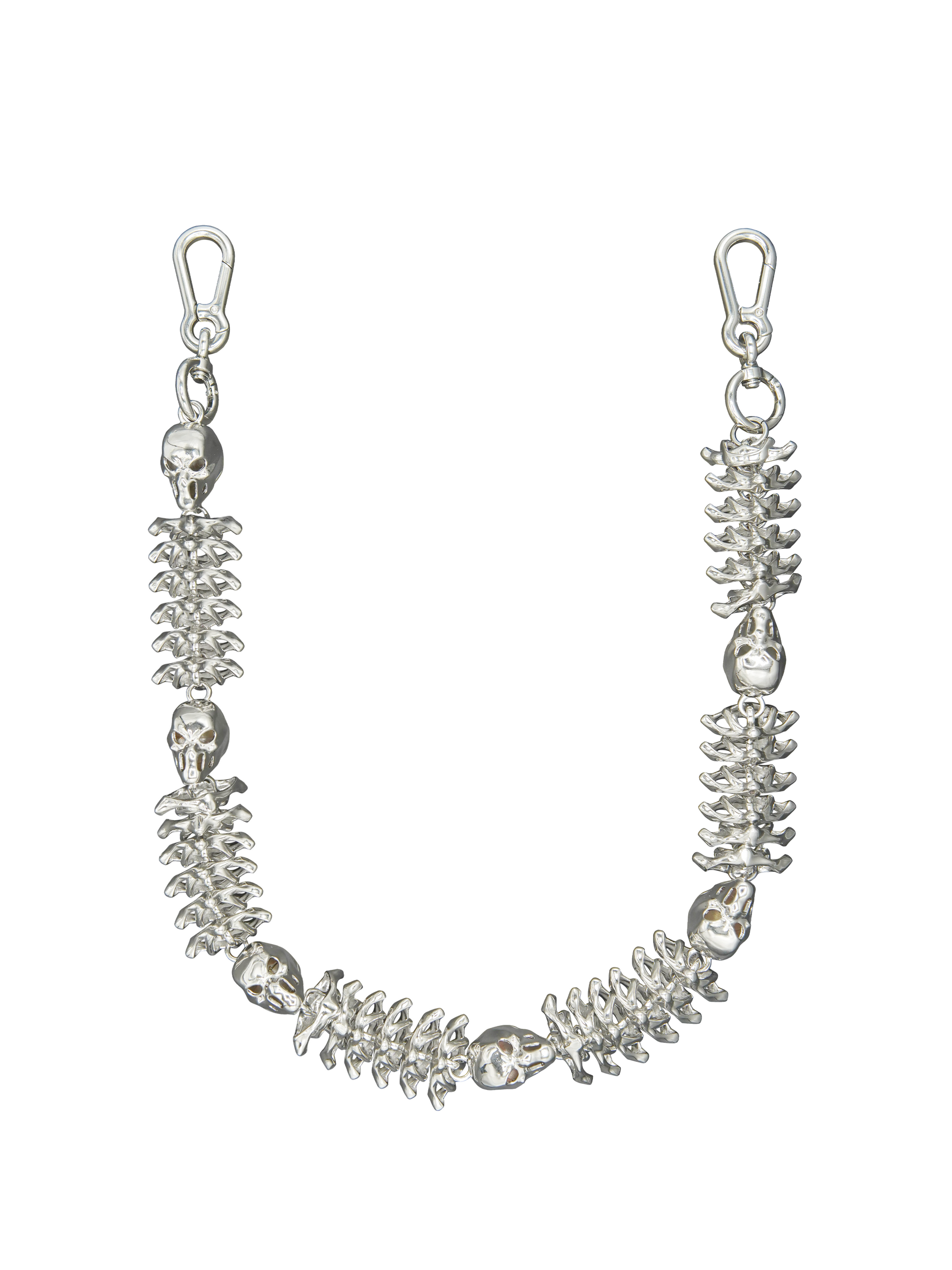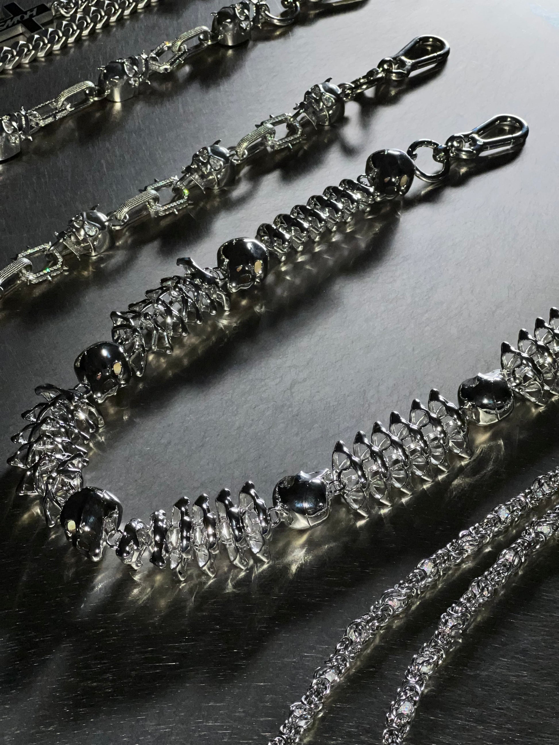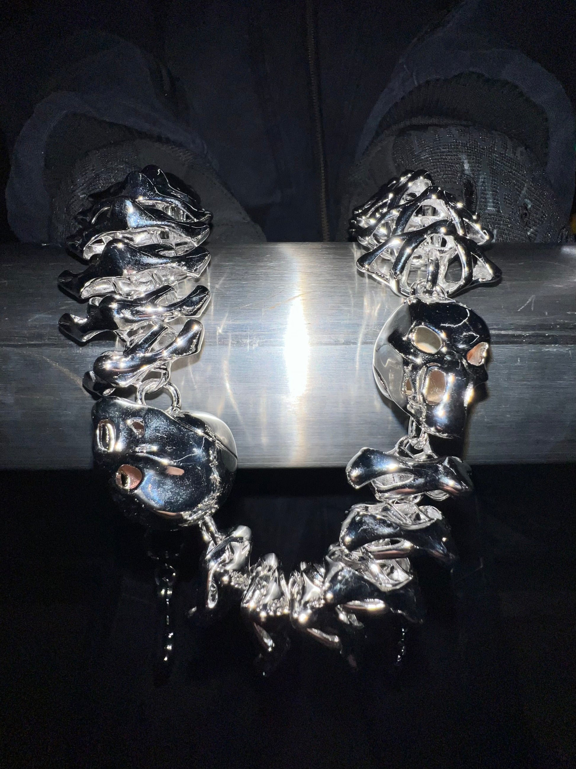 Crafted from solid brass and plated in white gold, the chain balances weight with cold brilliance. Each skull and vertebra is hand-sculpted and assembled, giving the piece a brutal precision with a futuristic edge.