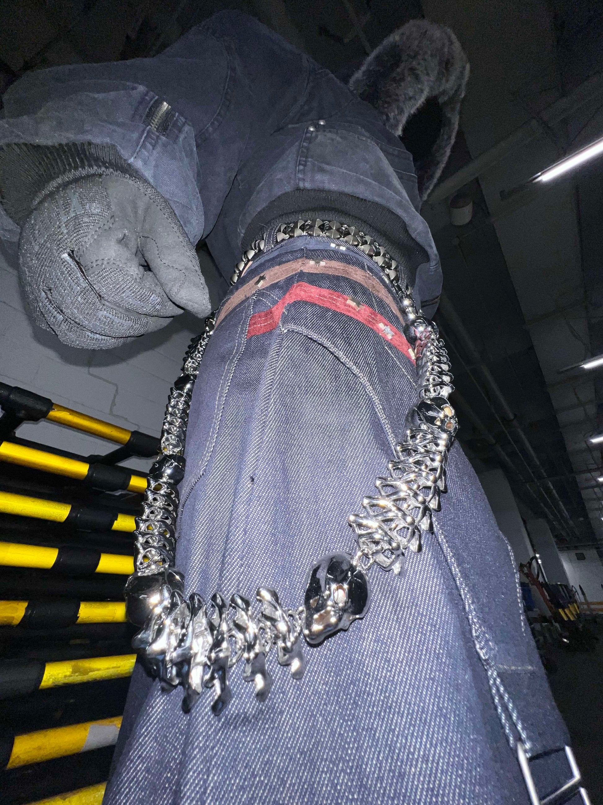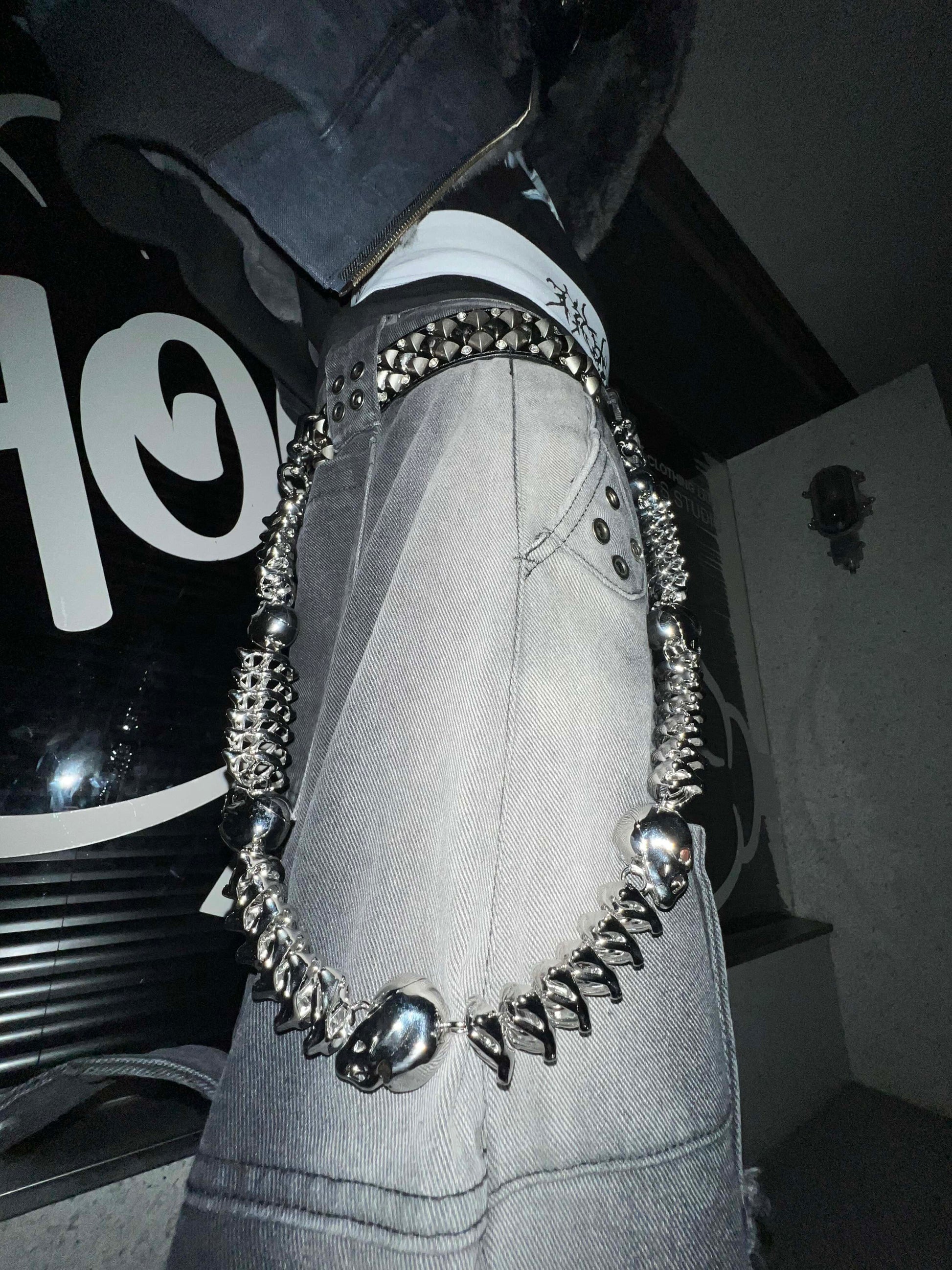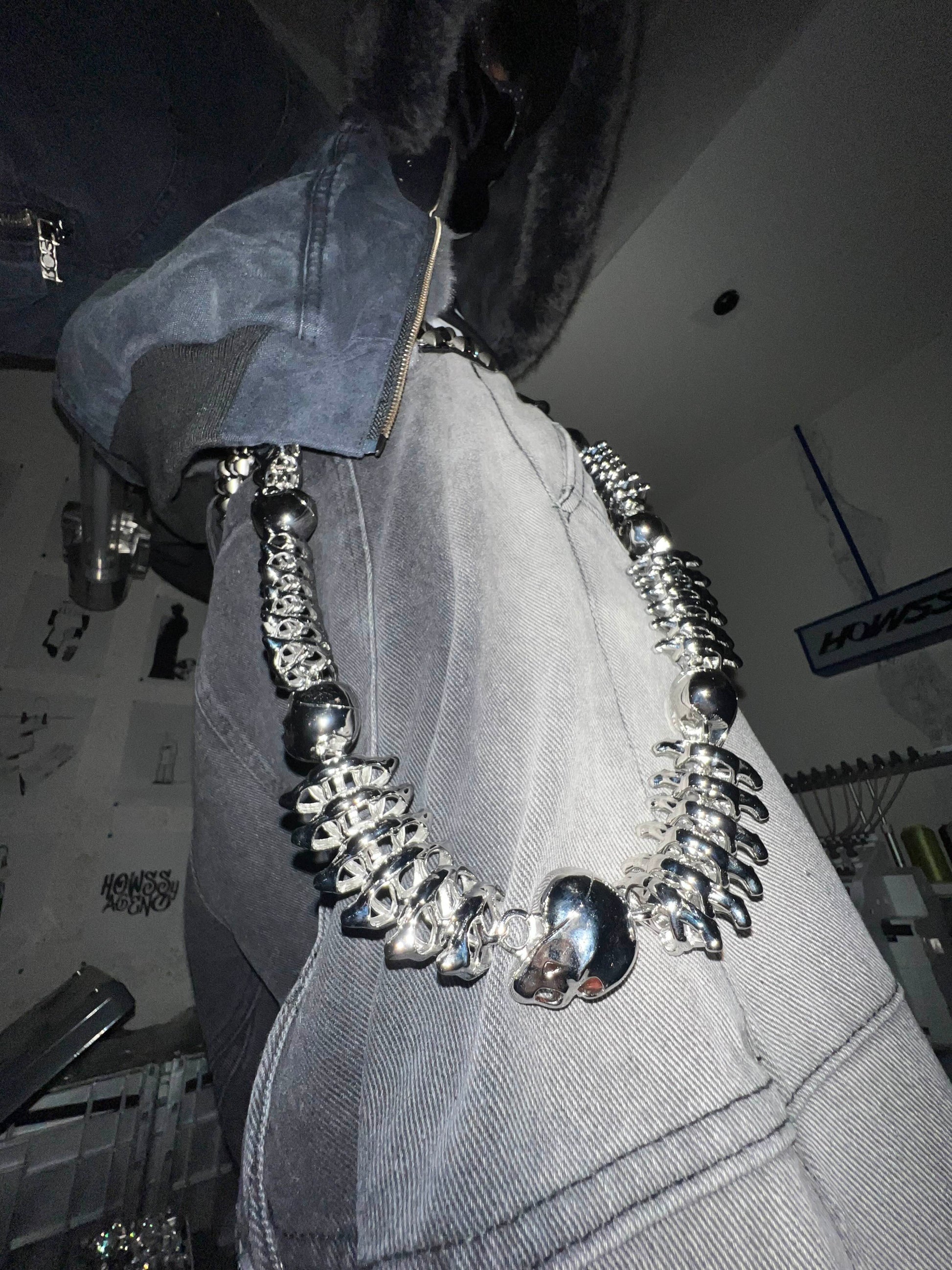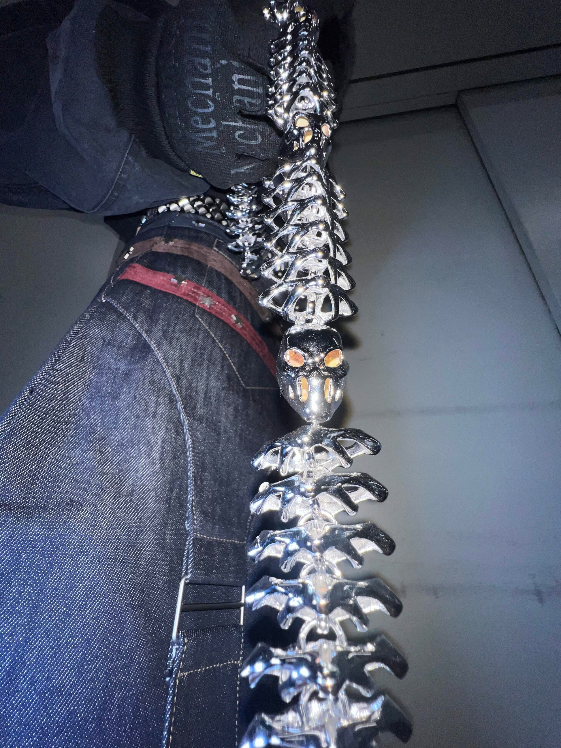Crafted from solid brass and plated in white gold, the chain balances weight with cold brilliance. Each skull and vertebra is hand-sculpted and assembled, giving the piece a brutal precision with a futuristic edge.