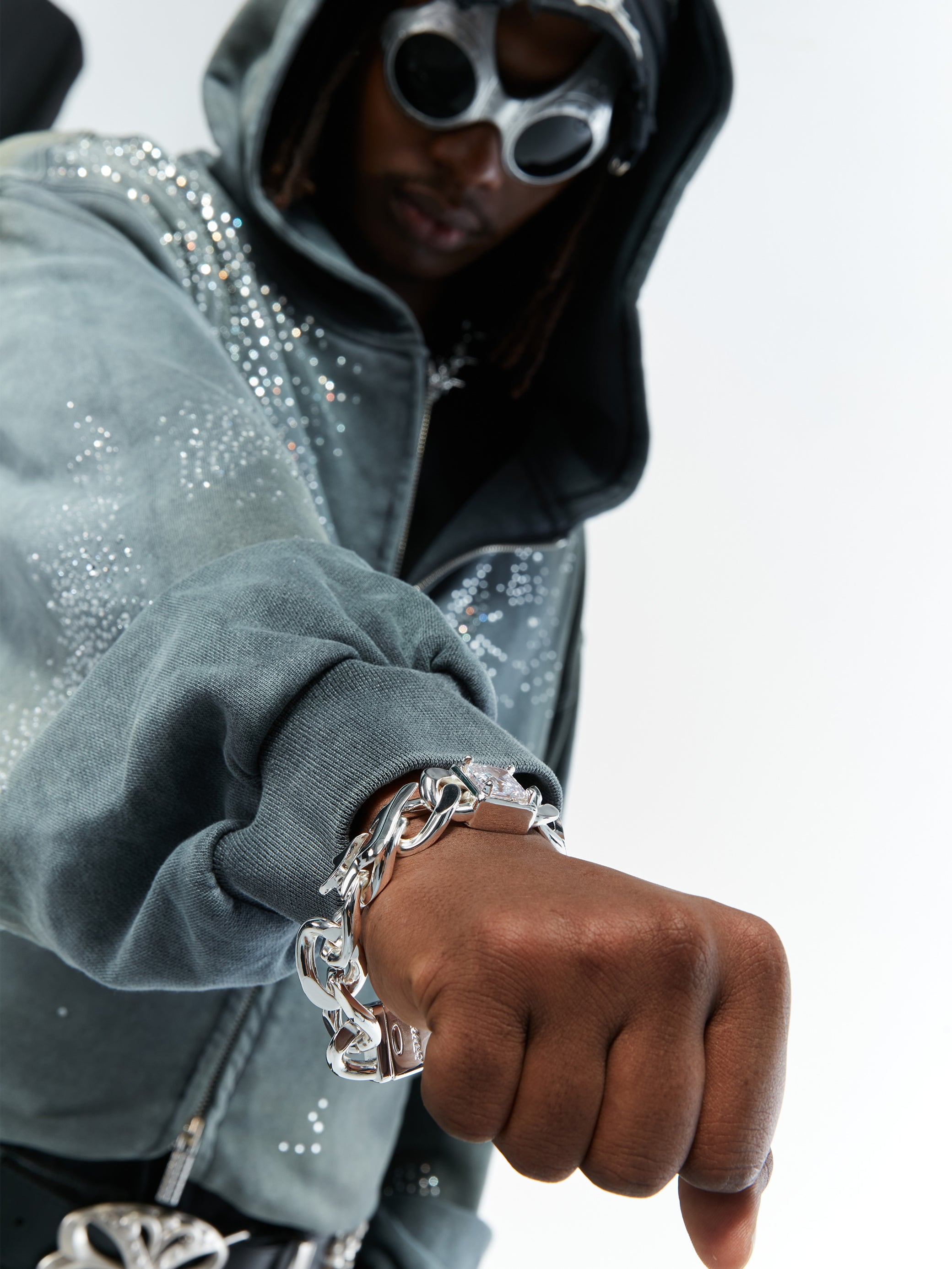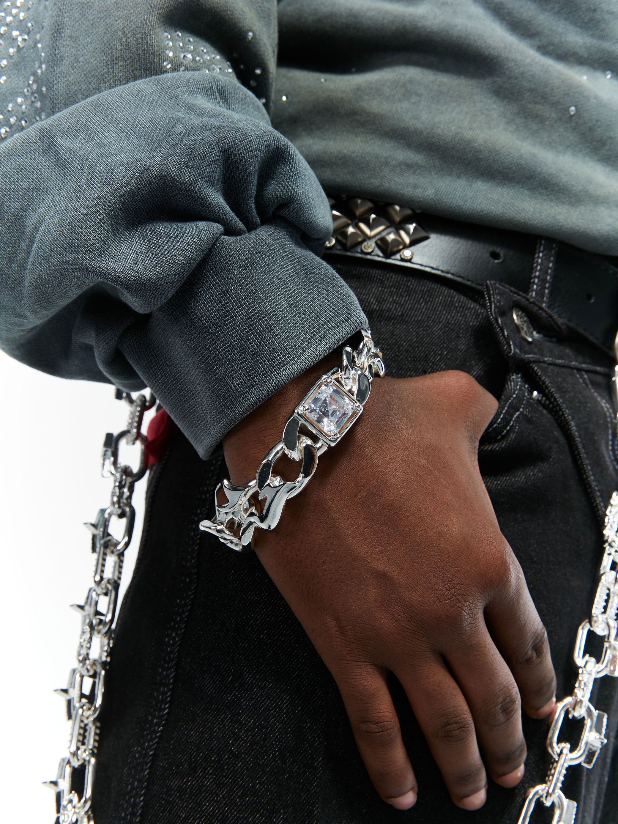 Built from copper with a silver-plated finish, this chain holds both weight and presence. Asscher-cut square zircons are precisely set on the flame chain body, throwing deep, mirror-like flashes with every move. Finished with a side-mounted warhammer pendant for a sharp, commanding edge.